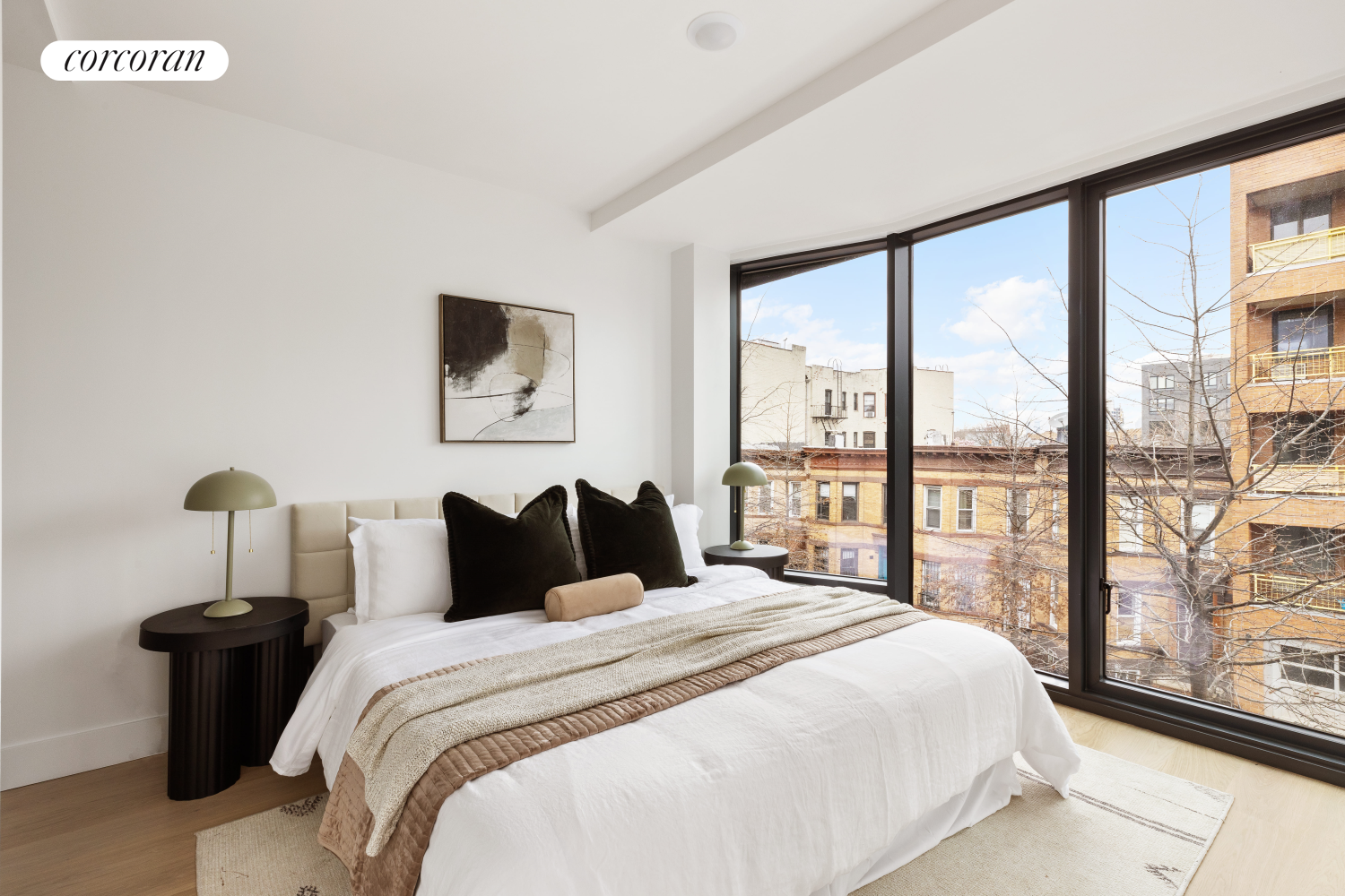 The primary suite features a king-sized bedroom, large closets, and a spa-like en-suite bath, while the secondary bedroom offers flexibility for a guest room, office, or nursery. A second full bathroom, in-unit washer/dryer, and multiple storage solutions complete the convenience.