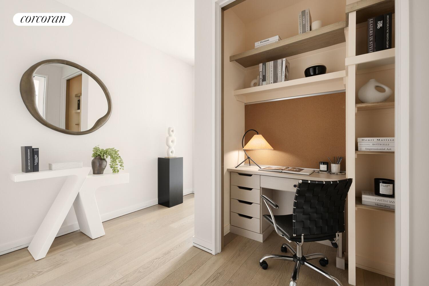 The generous primary bedroom suite is brightened by a wall of windows, featuring 2 large closets plus a third linen closet converted to a home office. The spa-inspired bath is clad in French limestone wall and floor tiles and also features a long dual-sink vanity of smoked oak, travertine slab backsplash, NuHeat radiant heat floors, glass-enclosed shower and upscale Philippe Starck-designed Hansgrohe fixtures. A spacious secondary suite includes a large closet, its own en-suite bath and a convenient desk or vanity niche - perfect for guests.