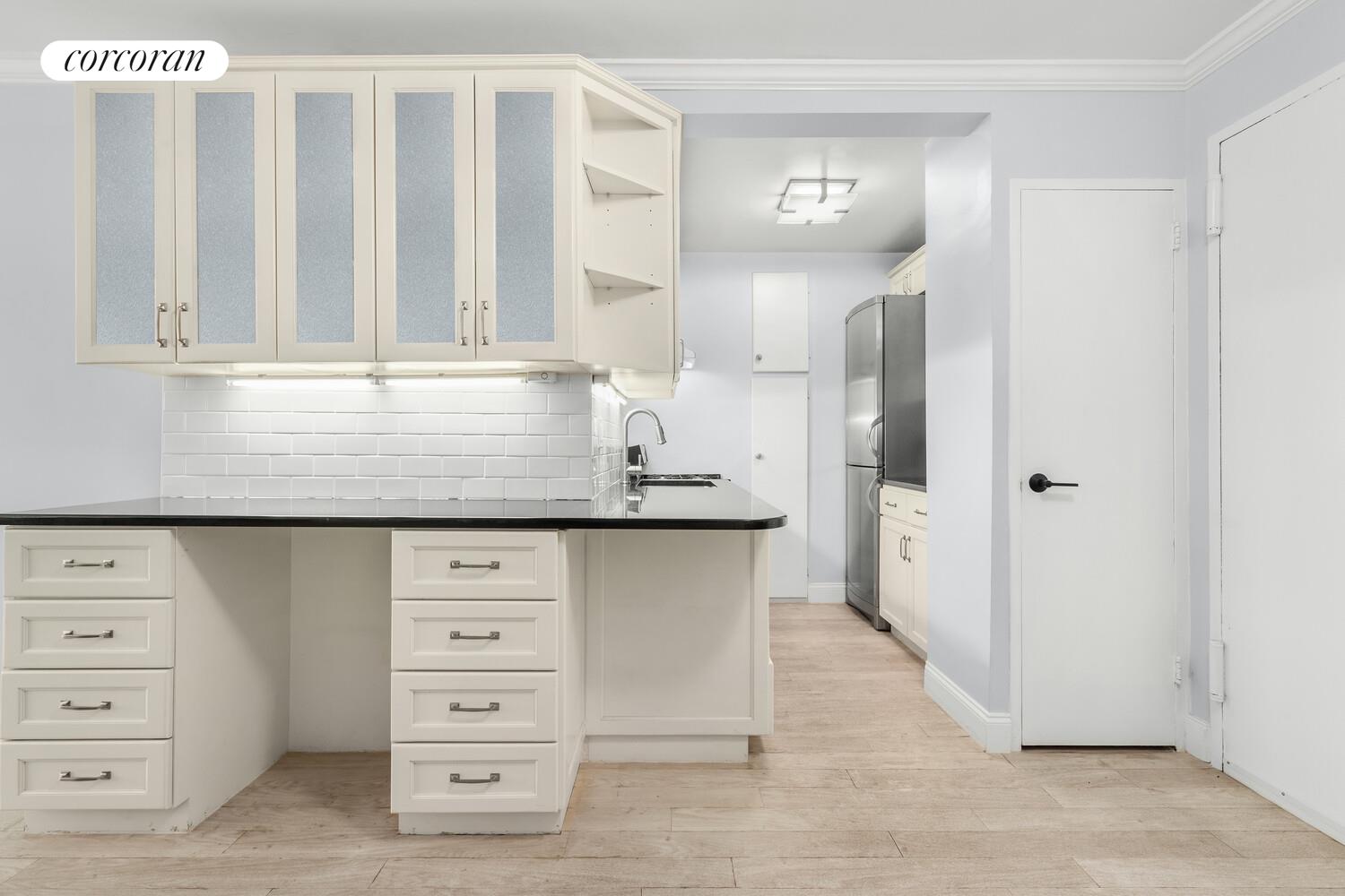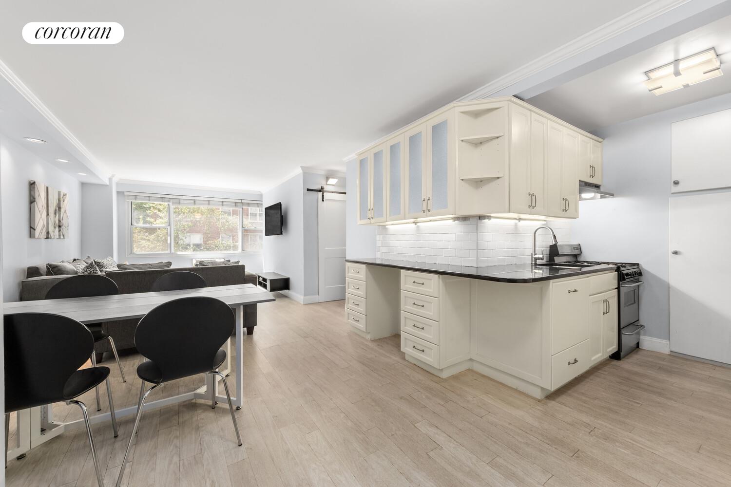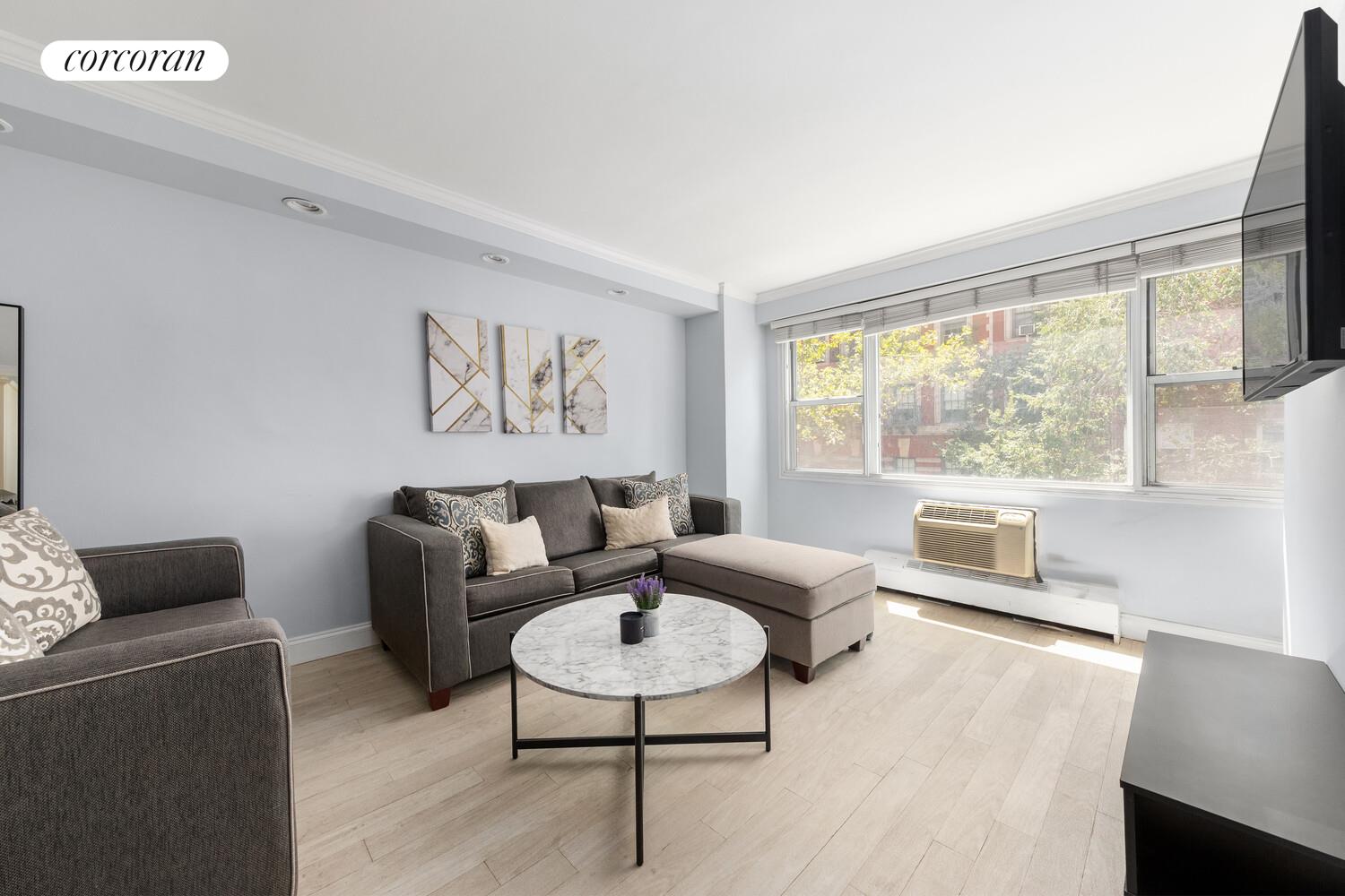 The spacious living room, with newly installed floors, easily accommodates both dining and lounging areas. Three oversized south-facing windows fill the space with natural light and offer picturesque treetop views along West 12th Street. The updated kitchen is outfitted with stainless steel appliances, including a dishwasher, and ample counter and cabinet space. Retreat to the queen-sized bedroom through a barn door, promoting privacy and relaxation. The recently renovated bathroom features a sleek, modern design with a glass-enclosed tub. Five closets, two through-wall air conditioning units, and CitiQuiet windows complete this move-in ready home.