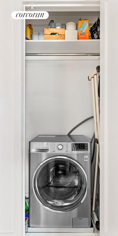 The spacious living room easily accommodates both lounge and dining areas and is anchored by hardwood floors and a beautifully scaled eastern-facing window that welcomes natural light all day. The windowed kitchen features full-size stainless steel appliances and solid wood cabinetry. The oversized bedroom enjoys two exposures, custom built-ins, and ample closet space. A crisp, recently renovated bathroom includes hexagonal tile, white subway tile, matte black fixtures, and a deep soaking tub. The in-unit LG washer/dryer is discreetly housed in a hallway closet for ultimate convenience.