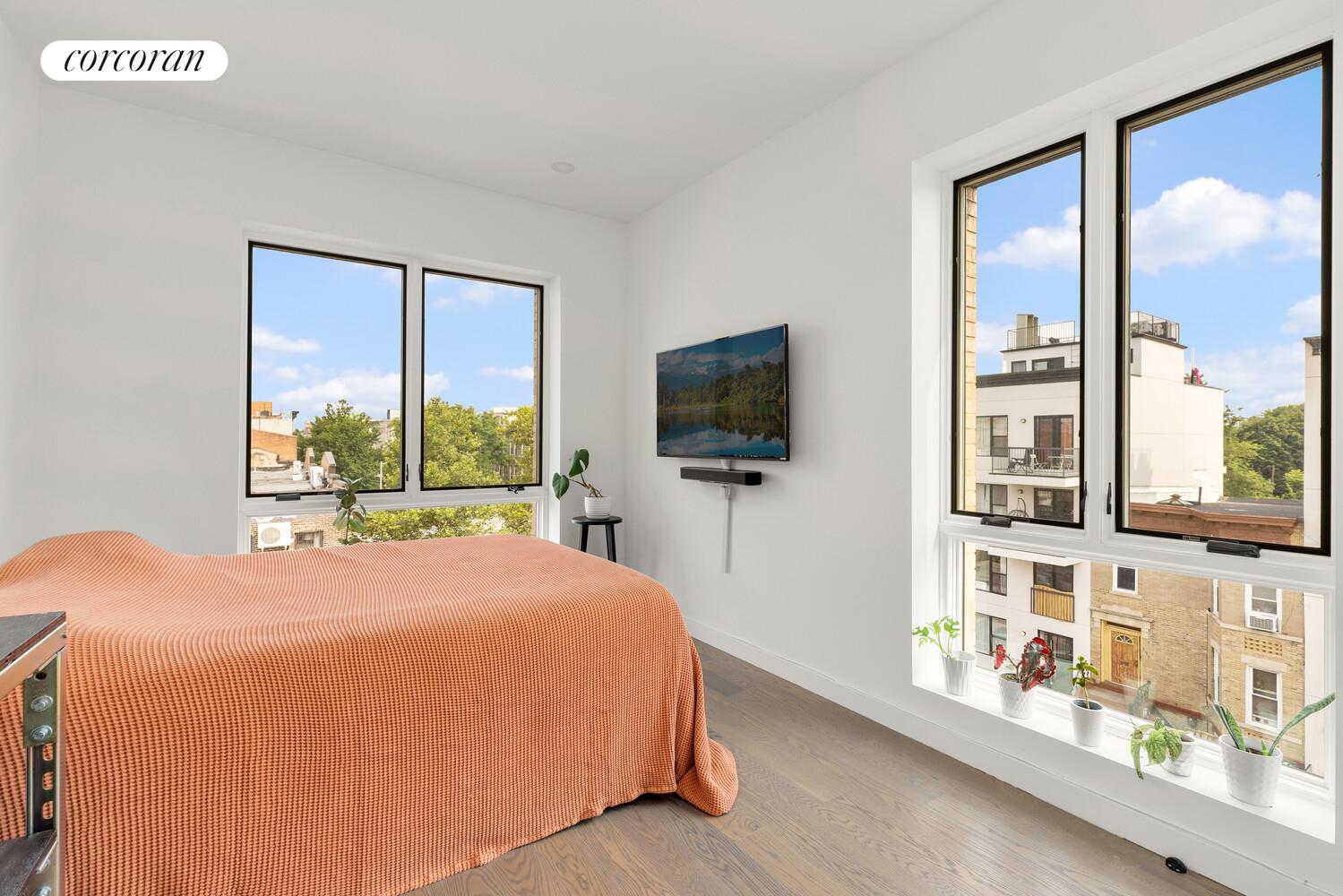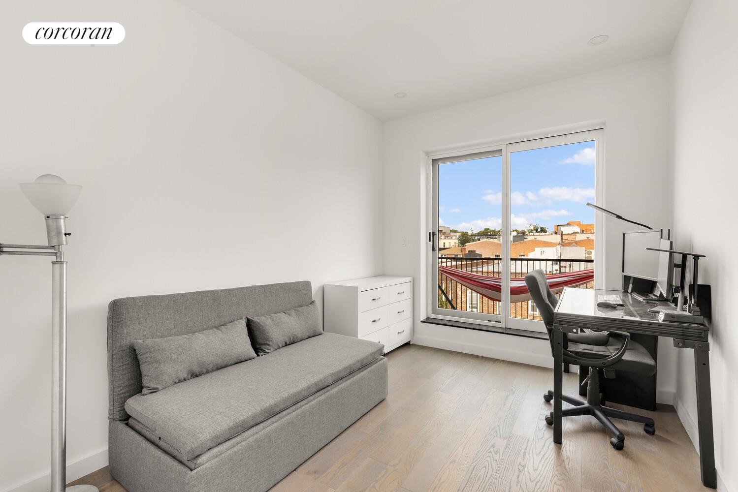 Bushwick 2 bed 1.5 bath beckons with private outdoor space on 3 levels! This 3rd and 4th floor duplex welcomes you into an open concept kitchen and living area with a balcony big enough to dine on. Clean lines and high ceilings feel modern and elegant. Large windows offer east and north western exposures for great light all day long. A generous breakfast bar can seat 4 with ease, and you could assuredly have a larger table as well. The kitchen is equipped with a Bosch appliance package.