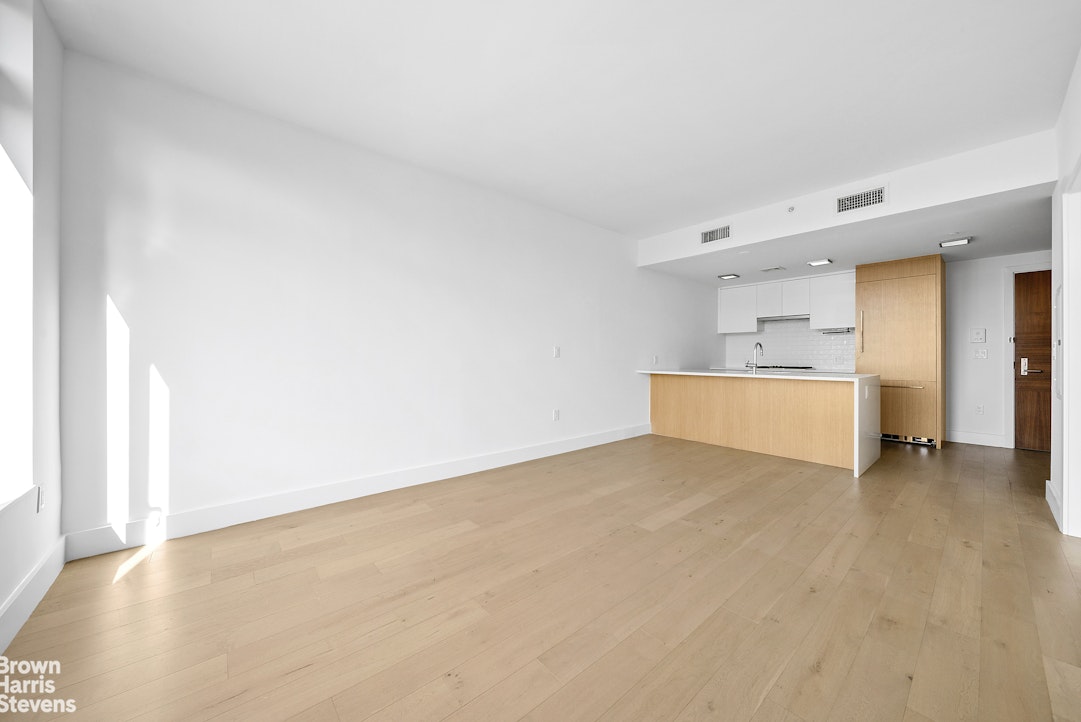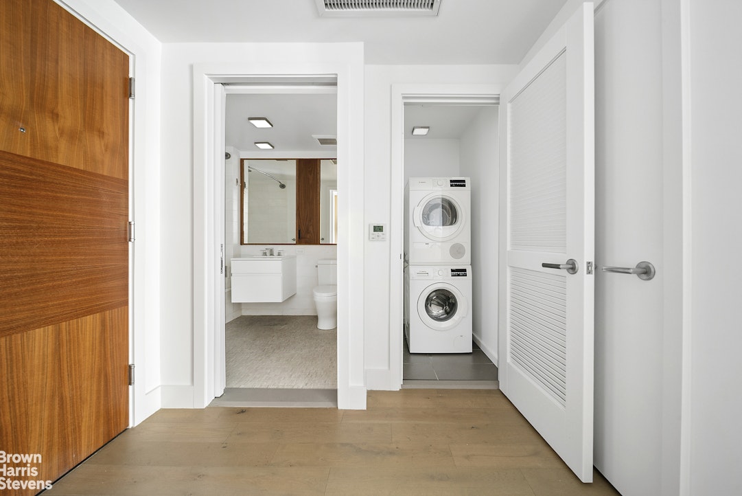 Welcome home to Apartment 4A - a meticulously crafted one-bedroom, one-bathroom corner unit bathed in natural light. The open kitchen features sleek pure white countertops, a convenient breakfast bar, and a full suite of premium Bosch appliances. The spacious bathroom offers walnut vanities, Signature fixtures, Caesarstone quartz countertops, and a deep soaking tub. Apartment 4A boasts beautiful sky views and southern exposures. Additional highlights include an in-unit stacked Bosch washer and dryer, central heat and A/C, and 6-inch wide-plank oak flooring throughout.