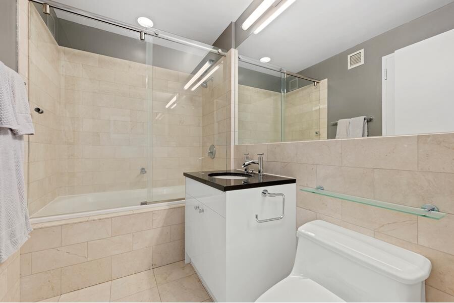 The primary bedroom suite is separated by a sliding door and hallway that leads to a corner king-size bedroom with two exposures, a full-size en-suite bathroom, and a large walk-in closet. The tiled en-suite bathroom features a soaking tub, linen closet, and additional closet housing the washer and dryer.