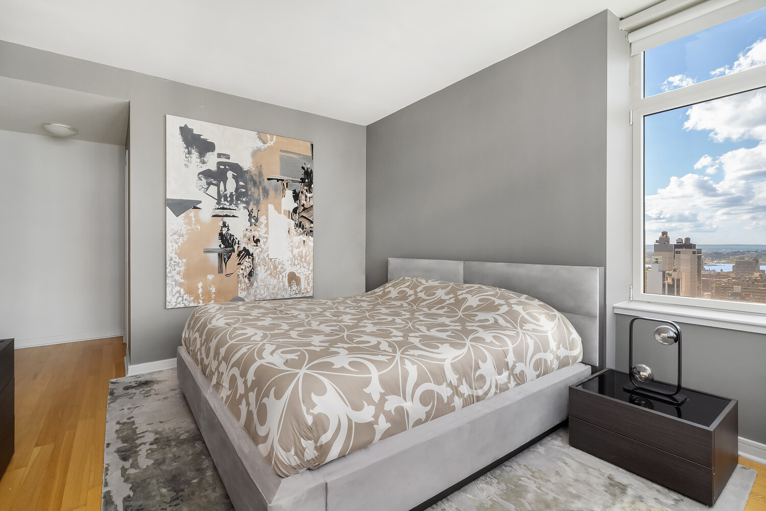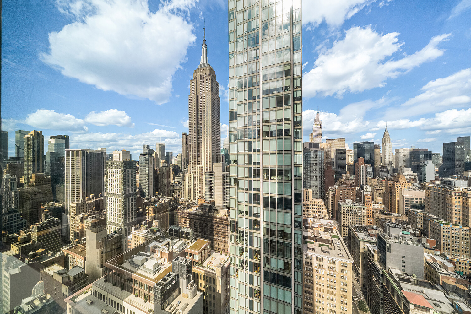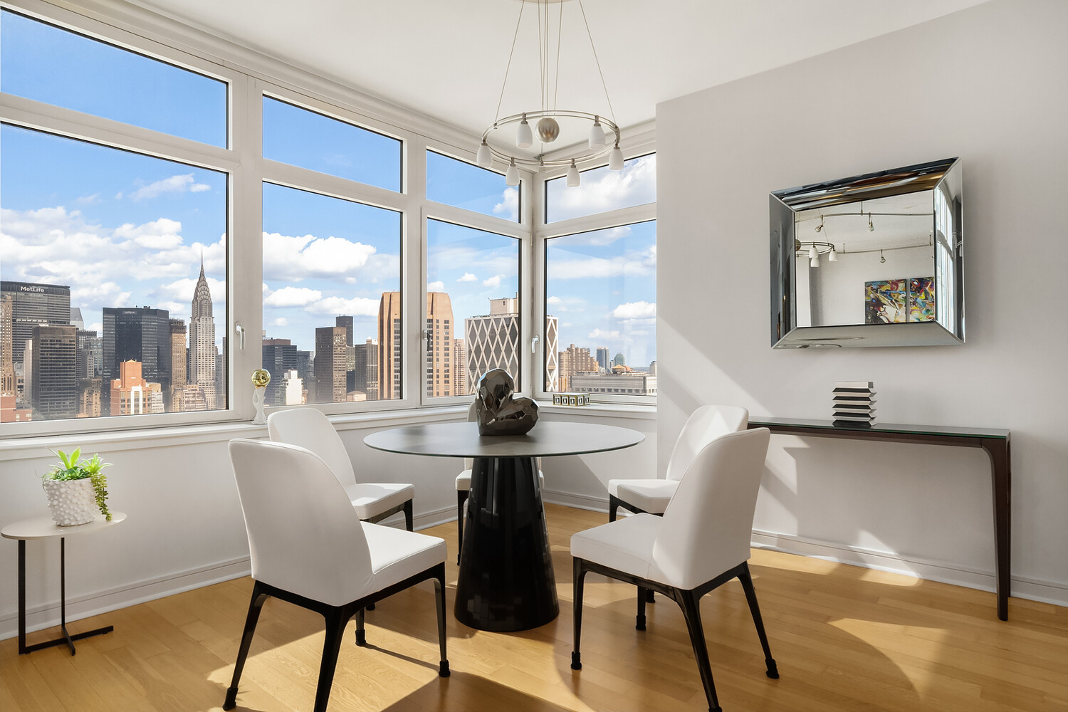 Huge, move-in-ready 991-square foot one-bedroom/one-and-a-half-bathroom home with spectacular views of the Empire State Building, Chrysler Building, Manhattan skyline, and both the Hudson and East Rivers from three exposures and wraparound windows.