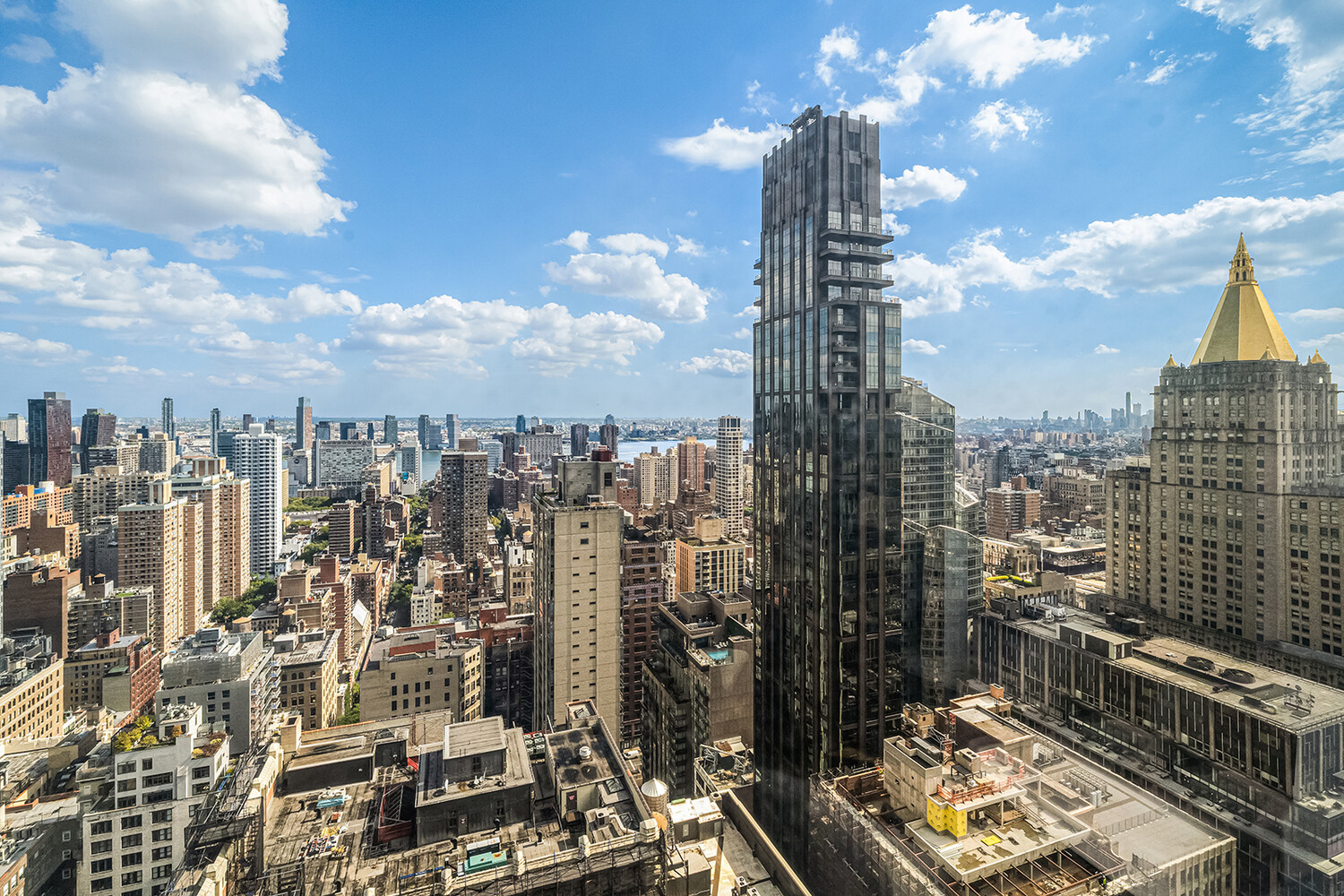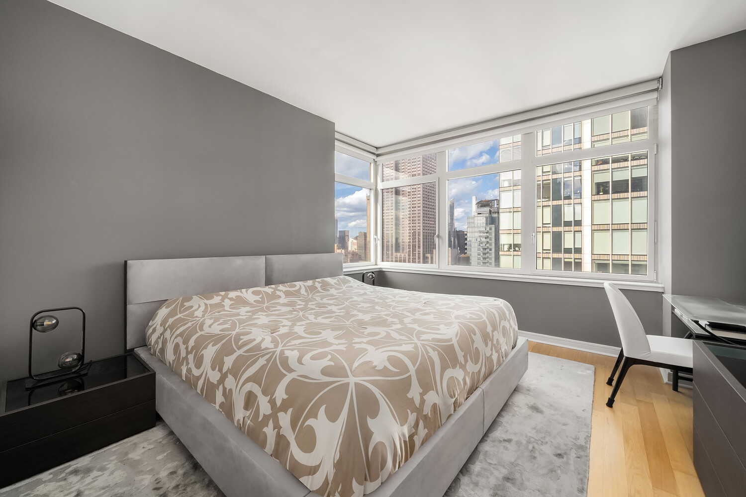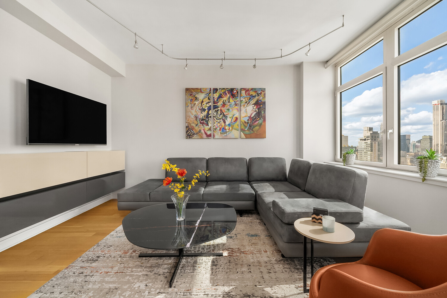 Huge, move-in-ready 991-square foot one-bedroom/one-and-a-half-bathroom home with spectacular views of the Empire State Building, Chrysler Building, Manhattan skyline, and both the Hudson and East Rivers from three exposures and wraparound windows.