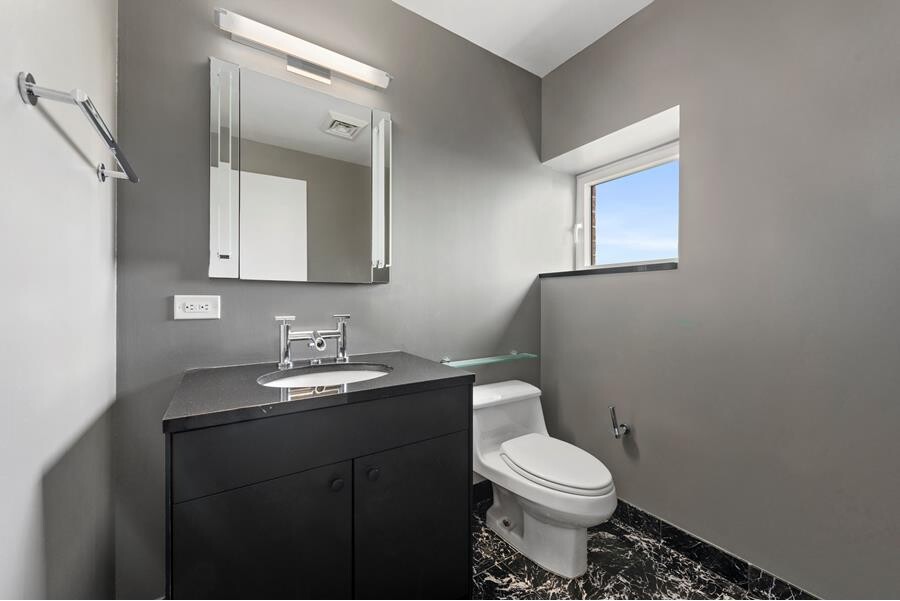 An entry foyer with a windowed powder room and coat closet leads to both the entertaining area of the home and separate primary bedroom suite. The large corner great room has two exposures and ample room for both a living area and dining area.