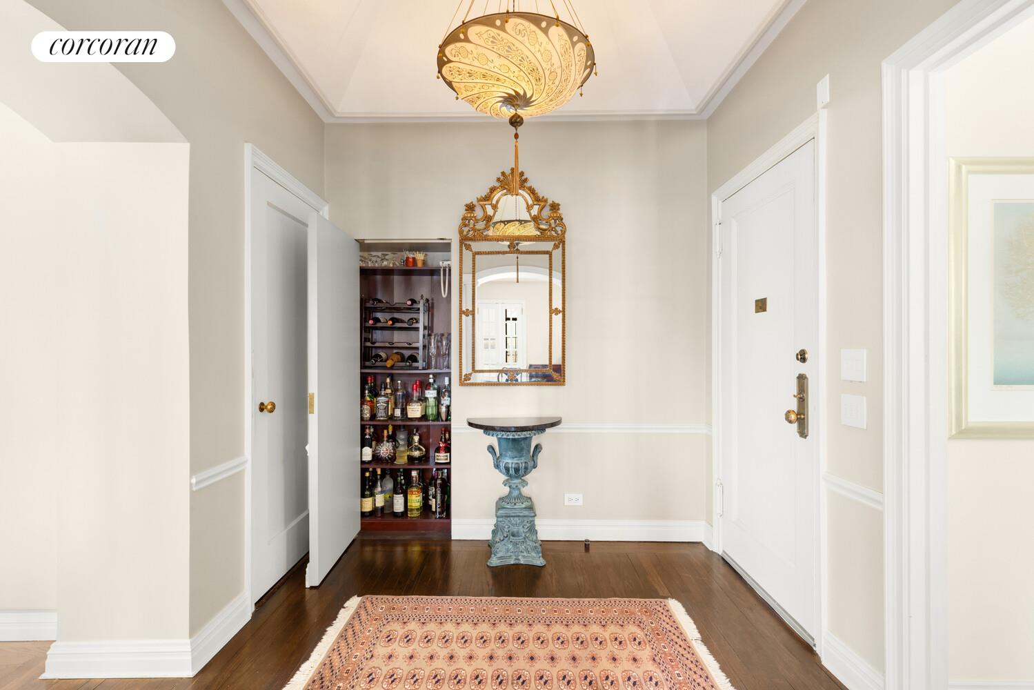 Off the entry foyer is a private hallway to the bathroom and bedroom, a great place for hanging artwork. The 12 x 12 foot king-sized sunlit, south-facing bedroom is spacious enough for a dresser and seating, and features a wall of beautifully appointed closets with mirrored doors and a cove ceiling reaching 9 feet 7 inches in height. The elegant bathroom includes a granite-topped vanity and walk-in shower with Waterworks and Coventry fixtures, and a spacious closet housing a convenient LG WASHER DRYER.