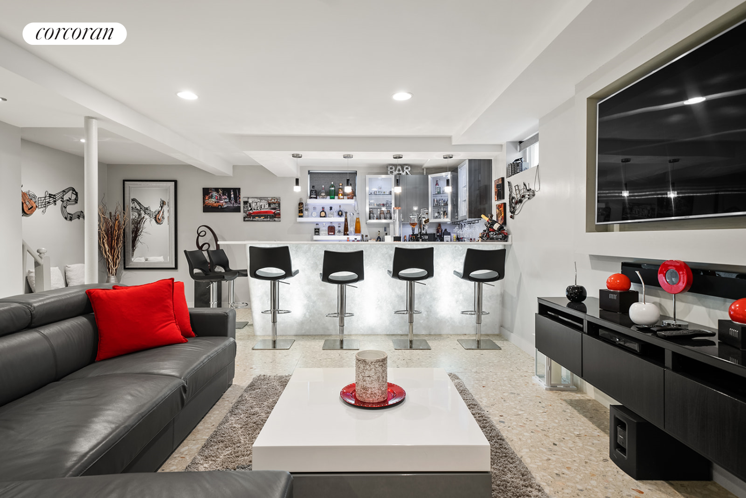 Other standout features include central air conditioning, hardwood floors, garage, elegant fireplace, washer and dryer, abundant closet space and a fully built bar in the basement with shelves, sink and a refrigerator.