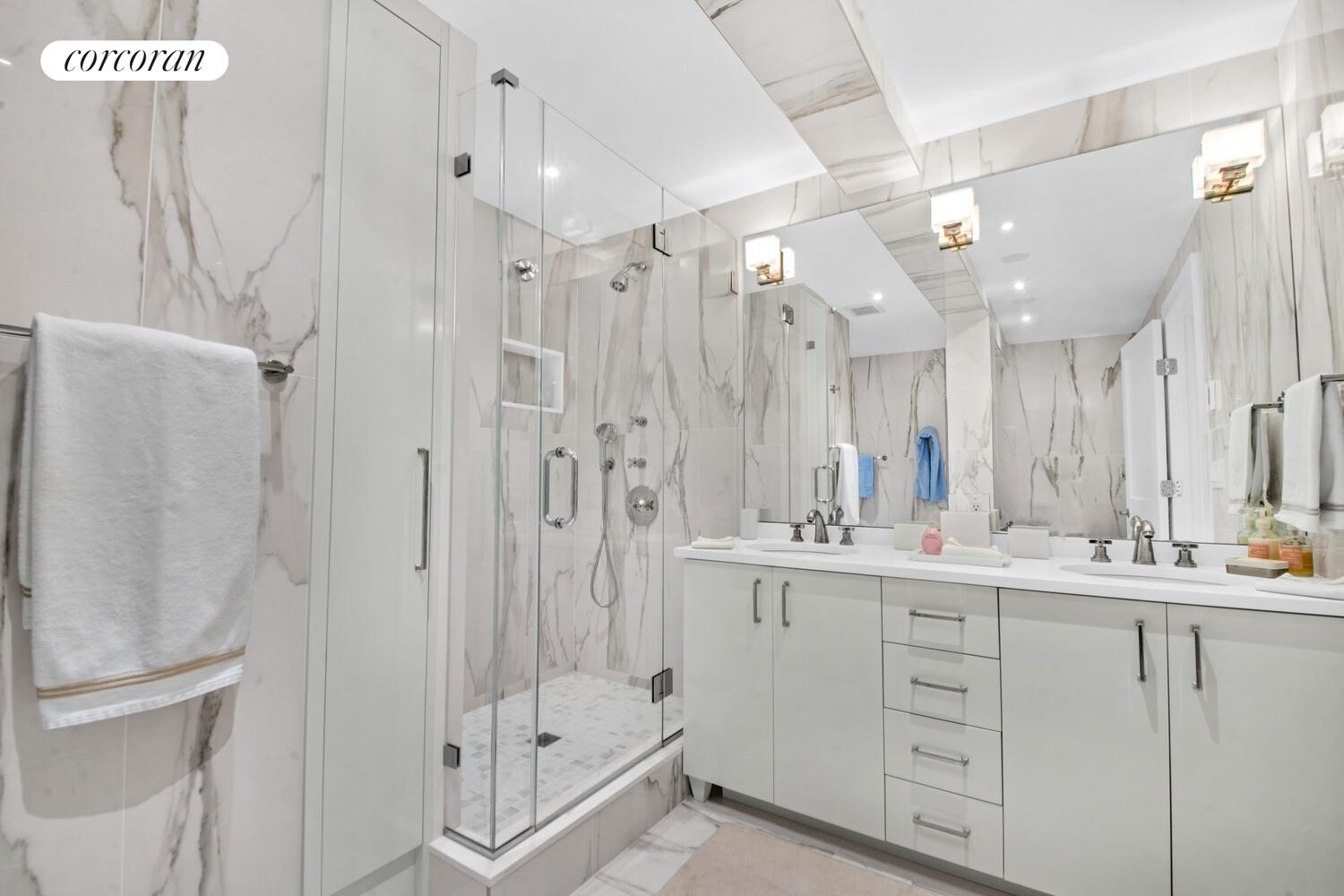 As you enter this magnificent home you are greeted by a foyer with abundant closets. To your right is your sanctuary, primary oversized size bedroom, a wall of windows, custom walk-in closet and a gorgeous spa-like marble ensuite bathroom. Luxuriate in your European bathtub, or relax in your king size shower stall and then stepping onto heated floors. This oasis is a true retreat. Once leaving the primary continue down the hallway to your washer/dry and more more storage. You will quickly focus to the heart of the home: a stunning open designer window kitchen with custom cabinets, built-in Liebherr refrigerator, stainless steel Fischer and Paykel stove. Built-in microwave, Bosch coffee maker and dishwasher all embraced by white quartz countertops with waterfall breakfast bar and a dining banquette flowing into your entertainment and relaxing living room. This spacious living room accommodates a sectional sofa, tables opposite your built-in media center for all to enjoy.