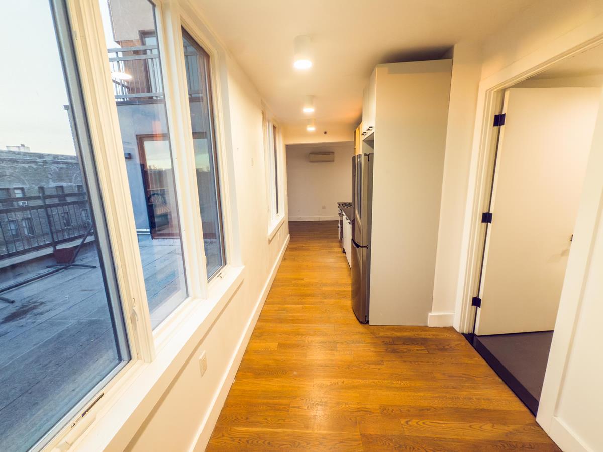 Rent Stabilized 2BR with large private outdoor space in an elevator building with laundry room, roof deck, gym and residents' lounge. The kitchen has stainless steel appliances and new cabinets.