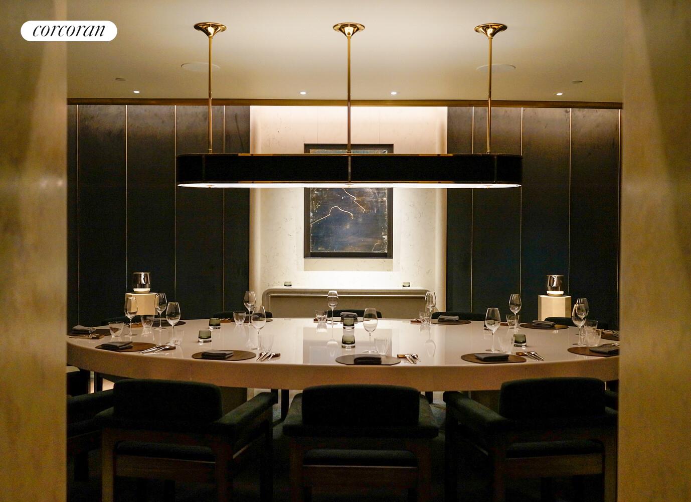 The Foster + Partners-designed open chef's kitchen features white oak cabinetry with integrated pulls and bronze detailing, cabinet-fronted Gaggenau stainless steel appliances, and brushed stainless steel knife edge countertop and backsplash with embedded ventilation and LED lighting - a true culinary delight that allows for seamless entertaining.