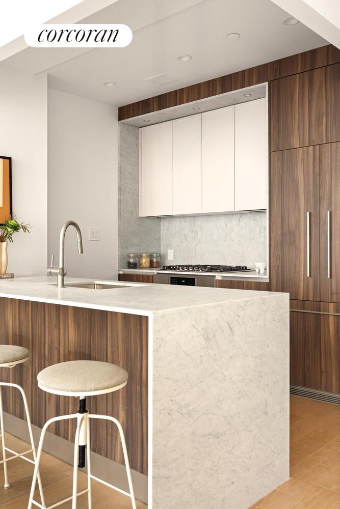 Recognized by a striking bronze-colored brick facade that seamlessly celebrates the brownstone vernacular of the surrounding tree-lined and historic streets, all the homes boast gracious layouts and timeless interiors. Extreme attention to every detail separates this jewel from the crowd, and it includes high ceilings, magnificent oak floors, multi-zoned heating and cooling, recessed lighting, and in-unit washers and dryers. Kitchens are outfitted with only the best, including Fisher Paykel, Miele, and Bosch appliances, including gas ranges; honed Carrara marble countertops and surrounds; and custom designed walnut and lacquer cabinetry with generous workspace. Classic Calacatta Gold marble and Travertine bathrooms are reimagined for a spa-like experience and include oversized slab tile, jewel-like brushed nickel hardware, custom-designed medicine cabinets and walnut vanities with great storage, deep soaking tubs, and glass-enclosed walk-in showers.