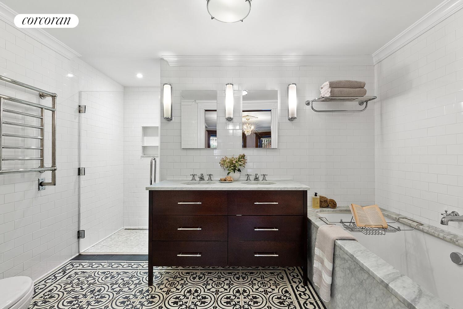 - Luxurious primary suite with en-suite 5-fixture marble bath, Kohler deep soaking tub for two, separate shower, and dual vanities with Newport brass fixtures.
