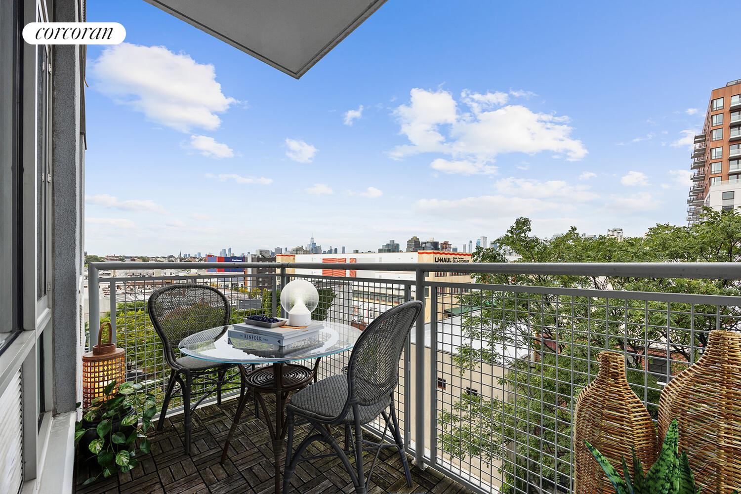Upon entering Apartment 6A, you're welcomed by modern finishes, hardwood floors, and abundant natural light. Oversized, noise-reducing windows run the full length of the home, creating a bright and serene atmosphere. The home's open kitchen features bamboo cabinetry, stainless steel appliances, and a Caesarstone breakfast bar under pendant lighting. Thoughtfully designed custom built-ins and closets provide excellent storage throughout. The bathroom includes a deep soaking tub. The spacious bedroom opens directly to a private terrace, and includes a versatile home office nook.