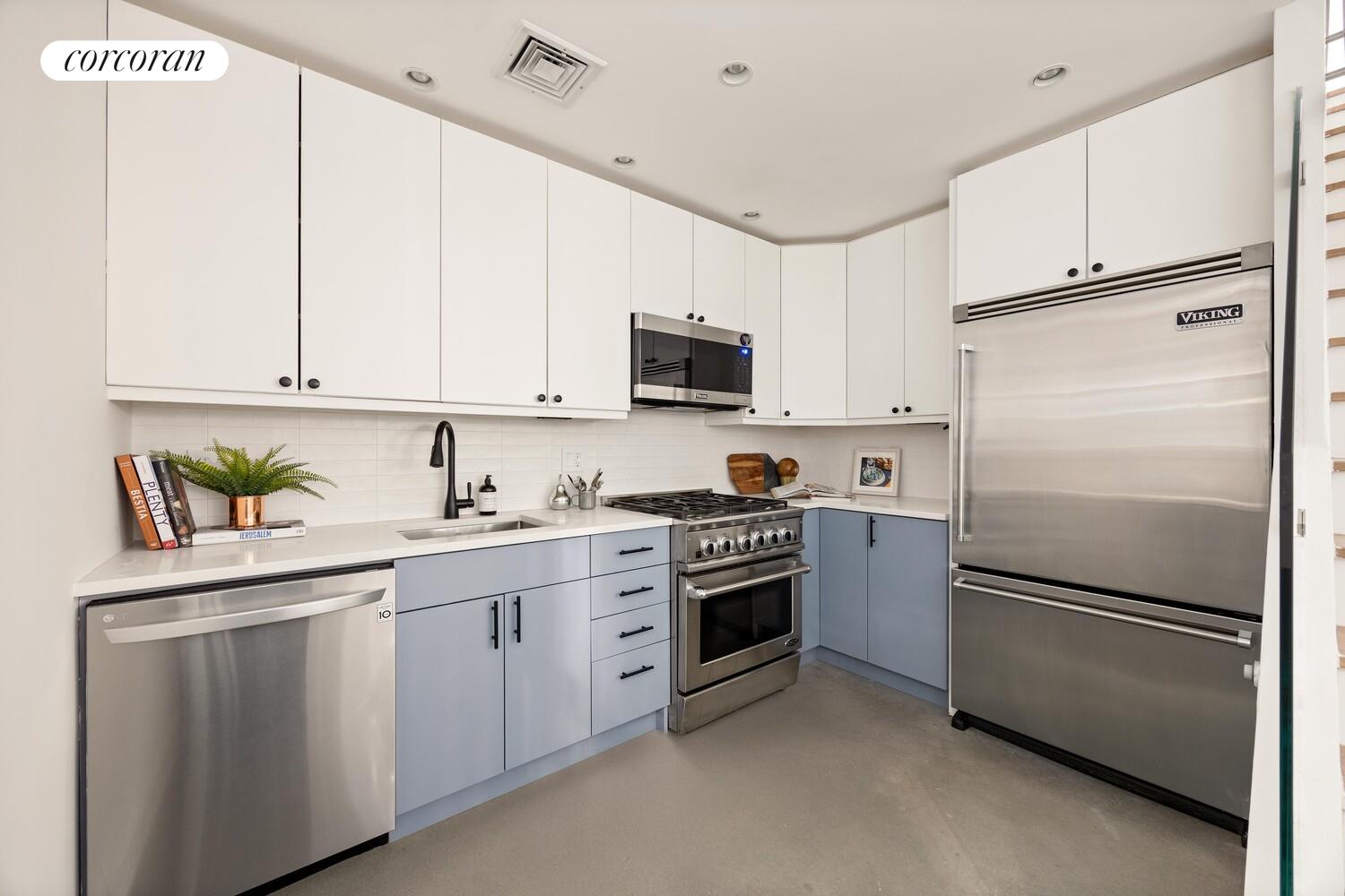 On the main level, you're welcomed by a spacious, open-concept living and dining area with a newly renovated chef's kitchen and striking poured concrete floors throughout. Outfitted with top-of-the-line appliances-including a DCS five-burner gas range, a 36-inch Viking professional refrigerator with an icemaker, and an LG dishwasher-this kitchen is as functional as it is beautiful, offering plenty of custom cabinetry for storage and elegant quartz countertops for prep. Enjoy an oversized living room perfect for comfy furniture, and an ample separate space for formal dining. Host dinner parties and holidays and have room for everyone at the table! There is even a full bathroom on this level should you choose to include a pullout sofa for overnight guests. The full bath on this level has been recently renovated and features Kohler fixtures, a deep soaking tub and shower, and classic black and white palette.