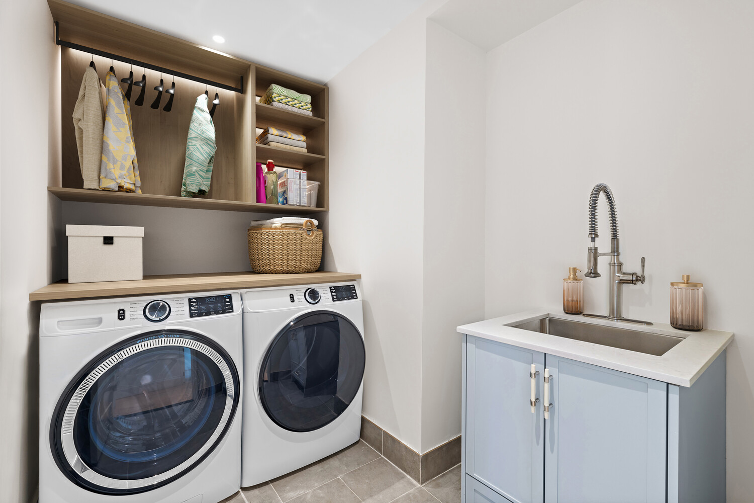 Secondary bedrooms are provided with ample closet space, while the secondary bathrooms feature custom White Oak vanities topped with Vanilla Pearl marble, Silveran marble floors, and Glazed Crackle tile walls and tub surrounds. Just off the entry, the glamorous powder room is finished with White Oak flooring and a custom vanity with Grande Antique marble. A dedicated laundry room includes a GE front-loading washer and dryer.