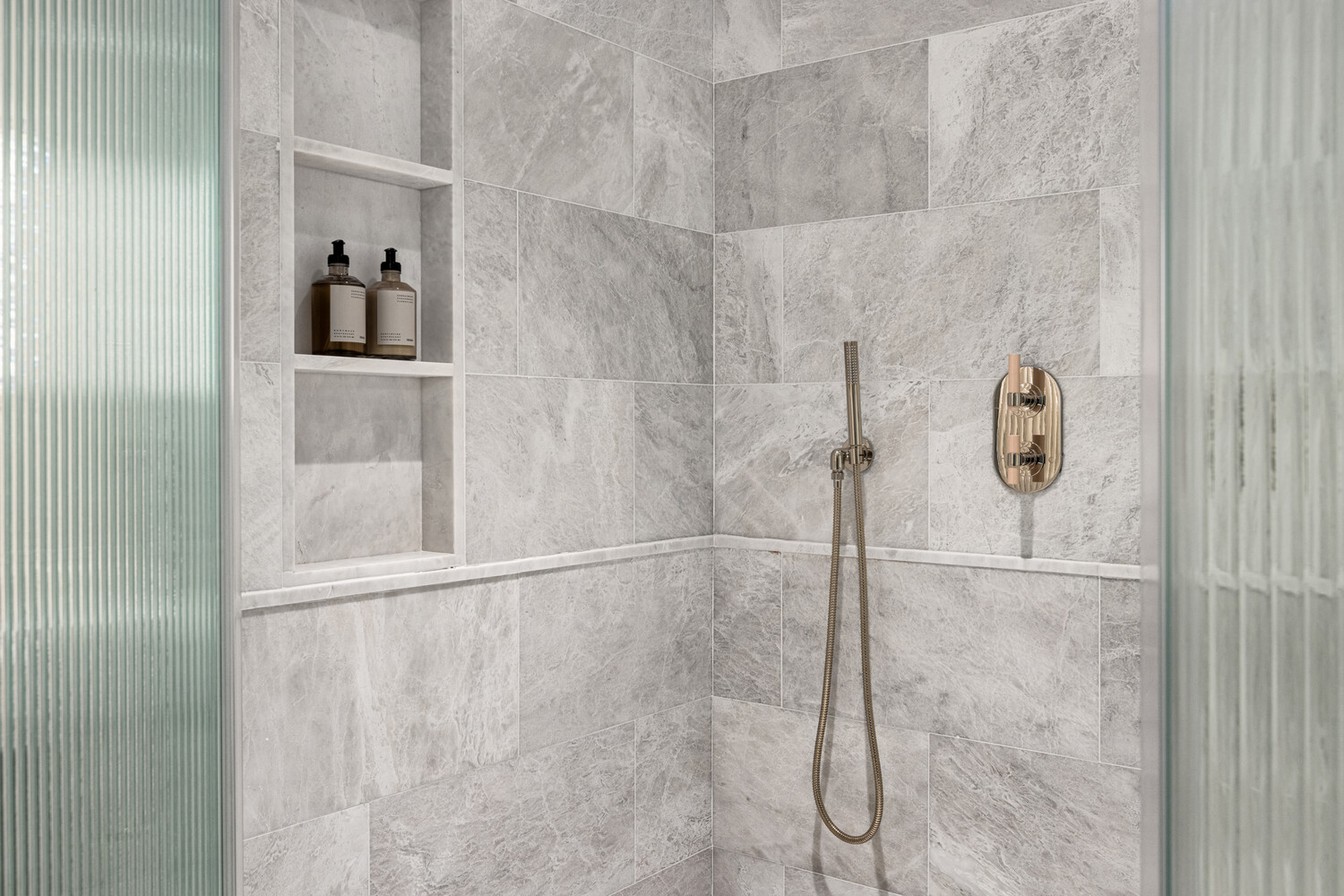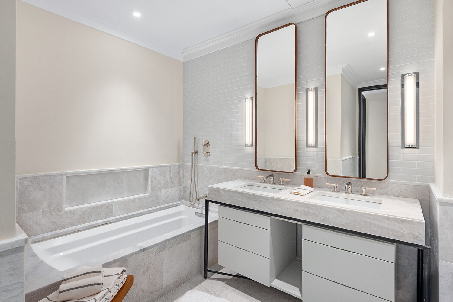 The serene primary bedroom suite features a large walk-in closet and a spa-like five-fixture primary bathroom, clad in Crystallo Pearl marble. Custom sconces flank the elegant metal and millwork vanity with saddle leather pulls, finished with bespoke Waterworks fixtures in polished nickel.