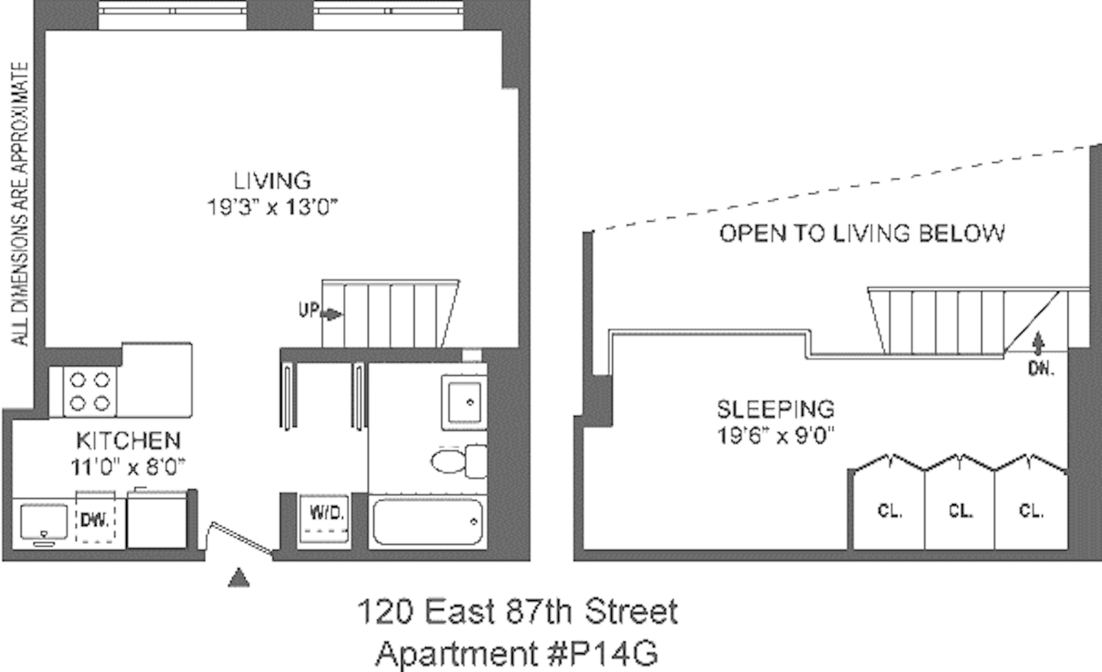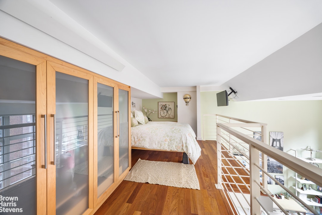 A dramatic duplex 1 bedroom home with double height ceilings and enormous south facing windows, providing wonderful light. Hardwood floors, a great living-room with a study area and built-ins, an open kitchen with stainless steel appliances, a bathroom with a BioBidet, a wall-mounted towel warmer and a washer and dryer.