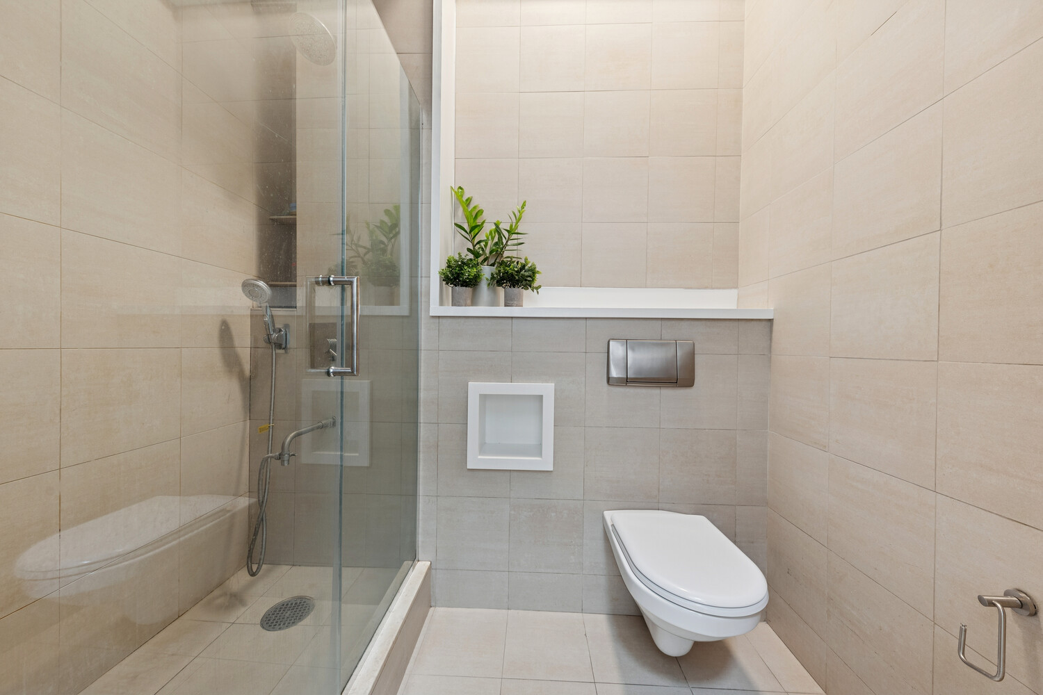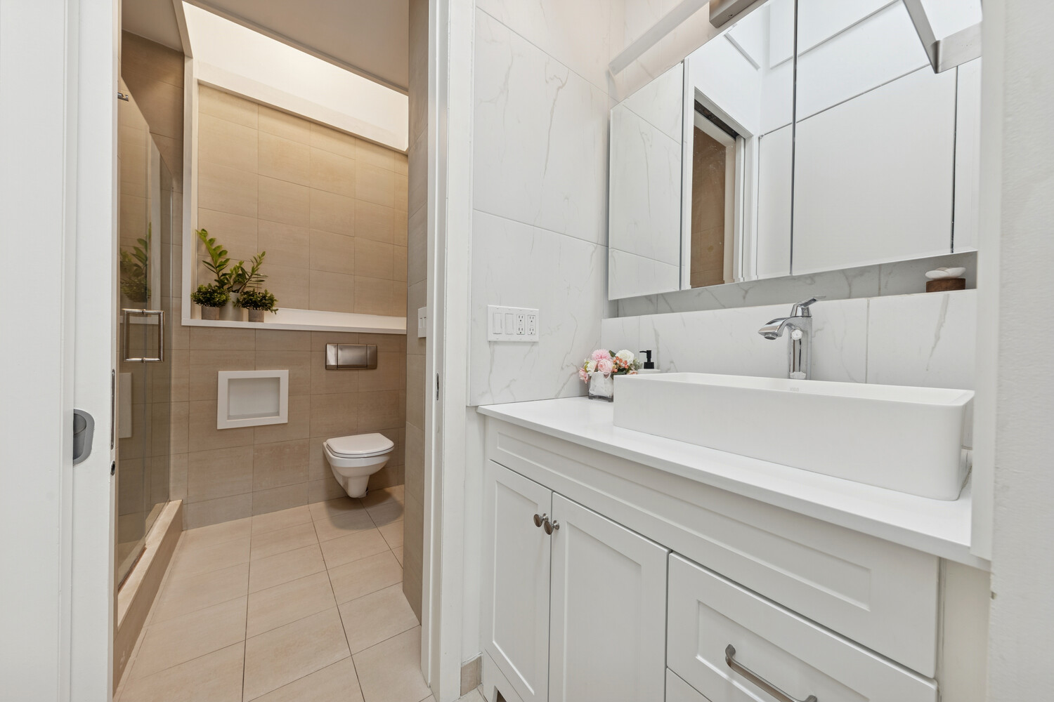The spa-inspired bathroom showcases a newly renovated shower and tile work, complemented by a sleek pocket door that separates the vanity area-combining modern style with smart design. With generous storage, refined finishes, and an inviting layout, this home is ideal for both relaxing and entertaining.