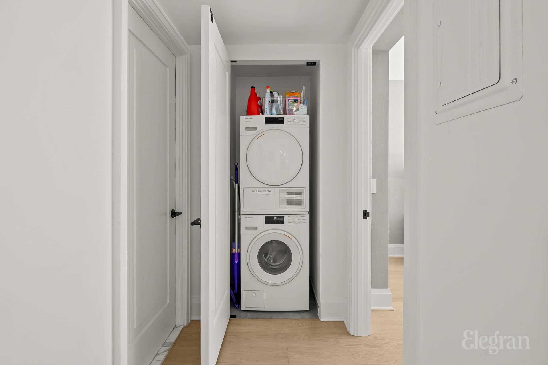 This 676 SF one-bedroom, one-bathroom residence is filled with eastern light and offers views of Battery Park’s greenery. Interiors feature 7-inch-wide oak flooring, Turkish Cristallo stone windowsills, and high-end finishes. The chef’s kitchen is equipped with Miele appliances, custom oak cabinetry, and honed marble counters and backsplash. The living and dining areas provide space for entertaining, while the primary suite includes a walk-in closet and a spa-inspired bathroom finished in statuary and Grigio Nicola marbles. A washer/dryer, smart thermostats, and eco-friendly touches add convenience.