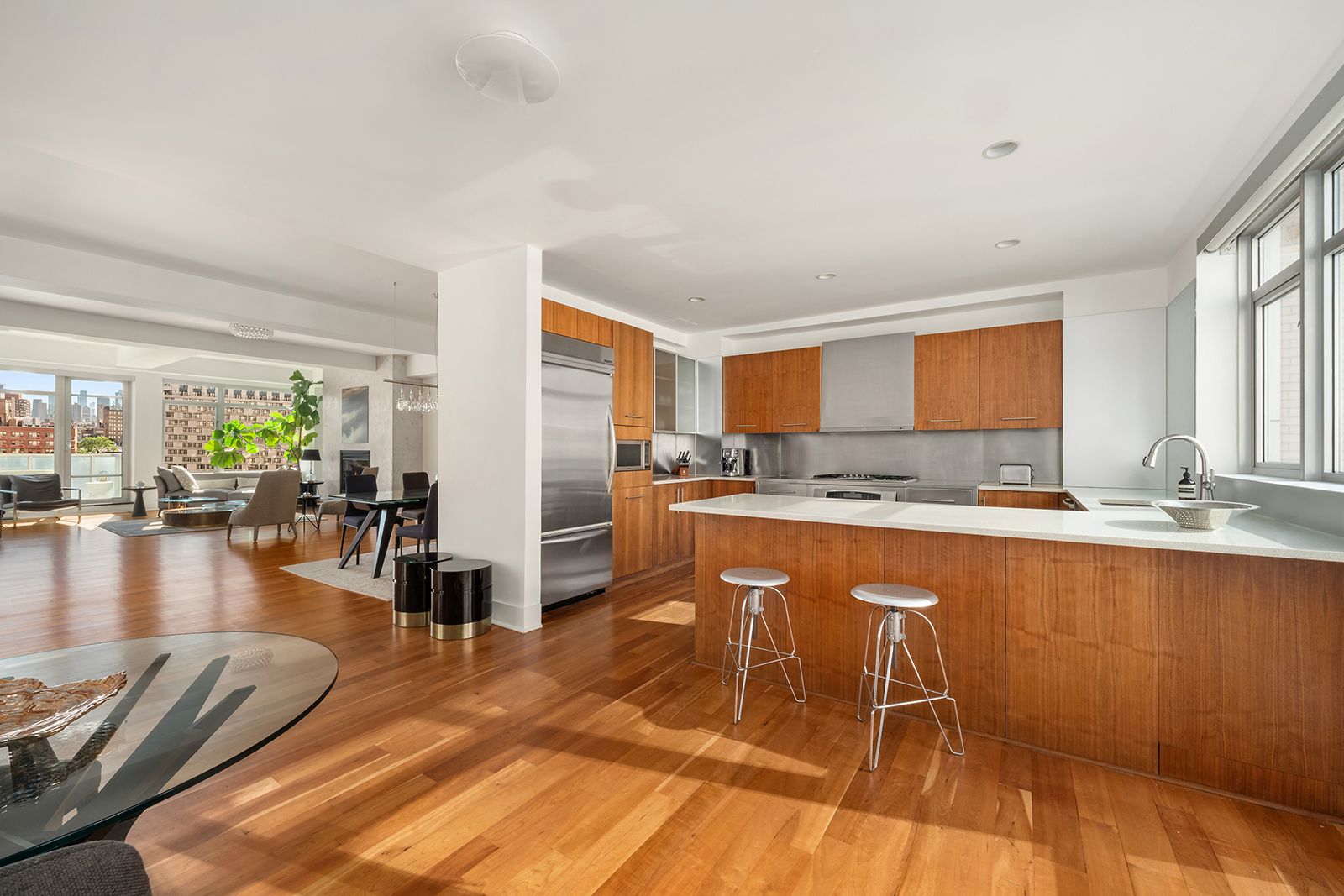 Light-filled and open, this elegant three bedroom, two-and-a-half-bathroom Penthouse sits perched atop the prestigious boutique condominium building at 426 West 58th Street. Sprawling over 2,615 ft², with sun-drenched interiors and sweeping panoramic city skyline views from every room, this exceptional home receives natural light from dawn to dusk and is the result of a meticulous approach to the finest fixtures and finishes.