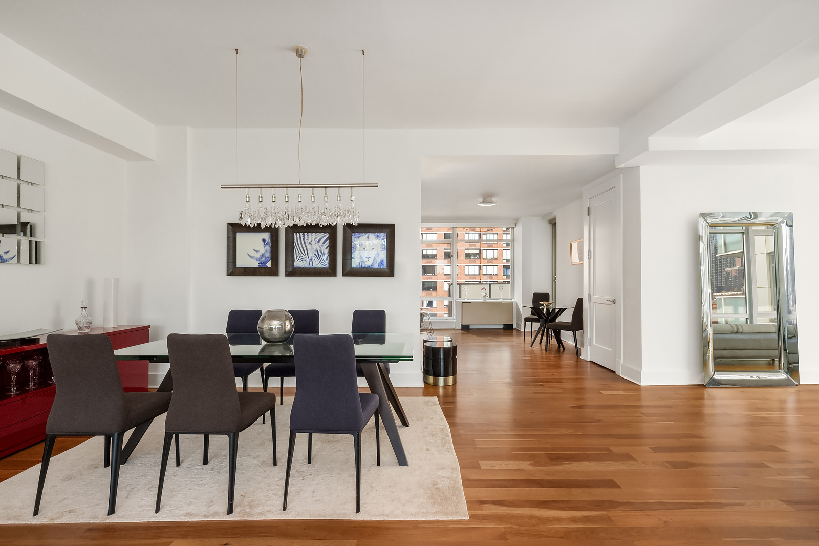 Entering the home via a private keyed elevator, you are met with a long gallery that separates the grand entertaining spaces from the serene private quarters. A huge living and dining area with southeast views boasts a gas fireplace and a terrace with iconic Manhattan views. The crisp, contemporary chef’s kitchen boasts a suite of appliances by Viking, SubZero and Bosch, granite countertops and ample storage solutions, as well as opening onto a northwest facing balcony.