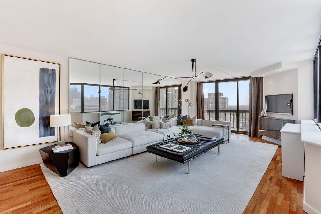 This approximately 2,400 +/- sq. ft. home in the sky features a flexible layout including a private home office, a large corner living room and formal dining room with dramatic views to the East and South, two private terraces and a washer/dryer. The master bedroom wing features a windowed walk-in closet/dressing room, en-suite spa bathroom, and views to the North and East. The recently updated open kitchen boasts white Caesarstone countertops and a breakfast bar for more informal dining. The guest suite is massive and bright featuring and en-suite windowed bath, open city views to the South and enough space to accommodate a king size bed and seating area.