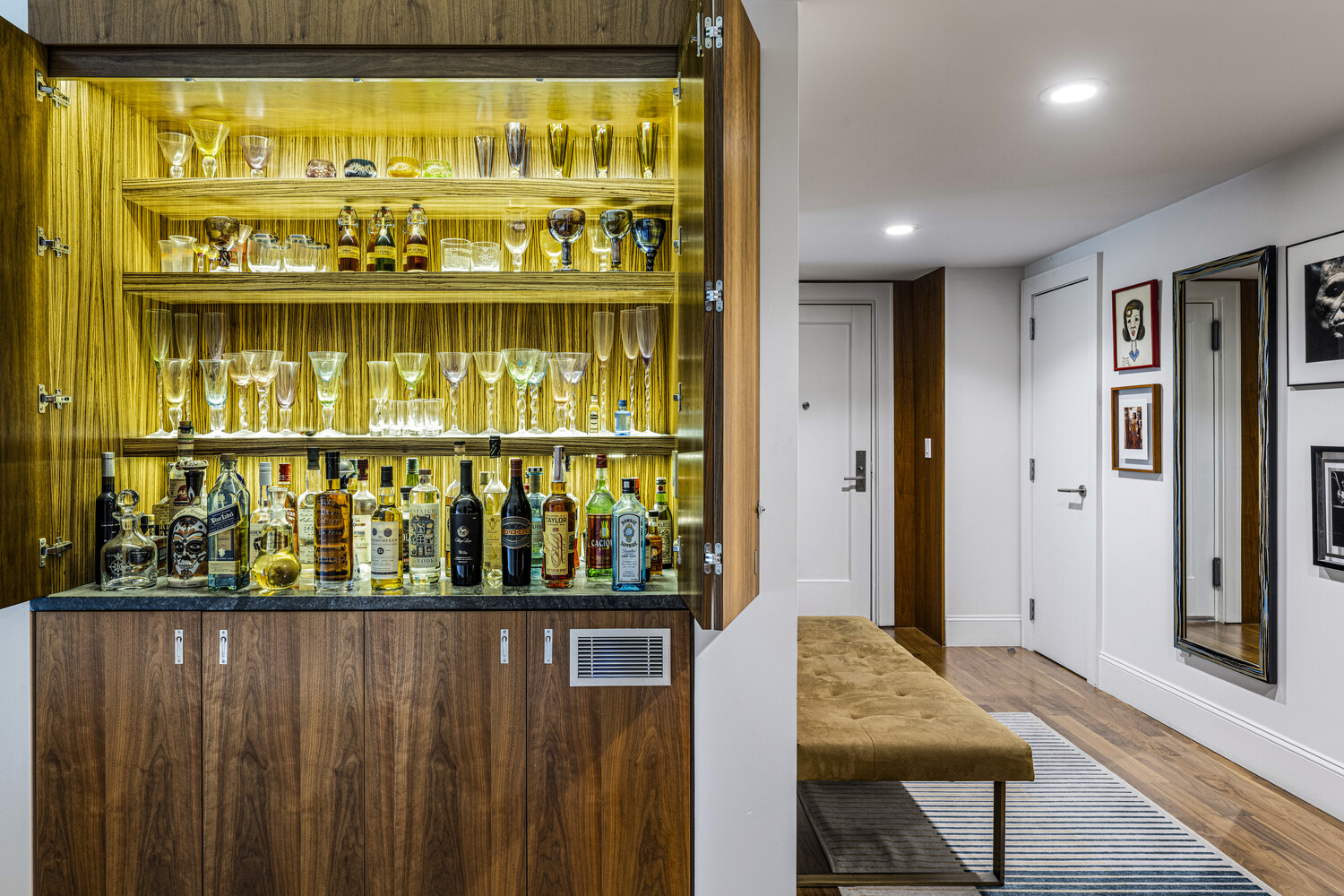 The home opens with a large entry gallery which flows into the spacious living and dining areas, featuring a wall of windows, a wood burning fireplace and a custom walnut and marble bar.