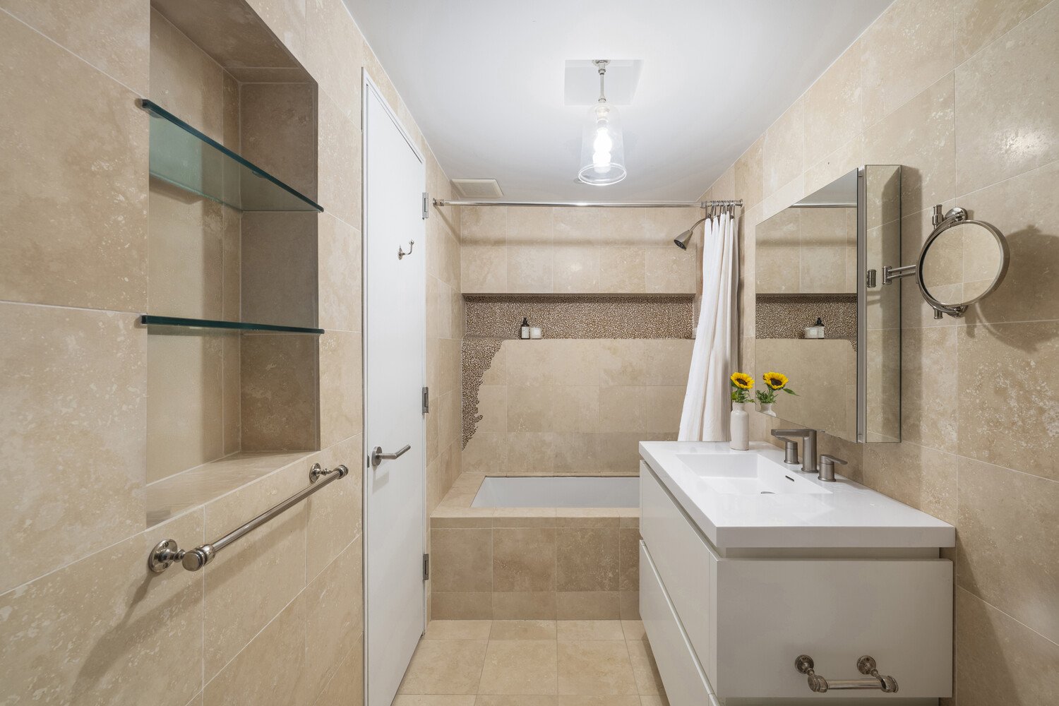 The second and third bedrooms share a renovated bathroom, multiple closets and southern and eastern interior exposures.