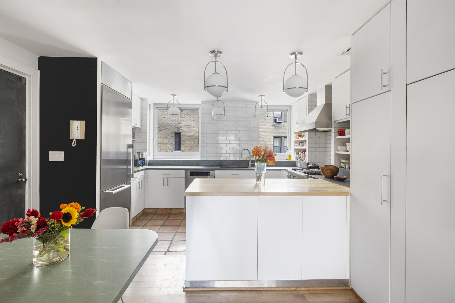 The expanded eat-in and open kitchen is perfect for the at-home chef and entertaining alike. There's a large breakfast bar, custom cabinetry, classic subway tile backsplash and Viking, Miele and Wolf appliances plus a stacked Frigidaire washer and dryer.