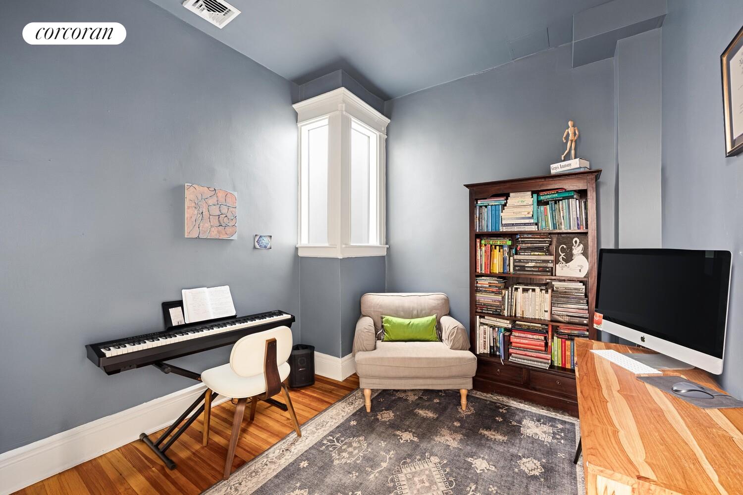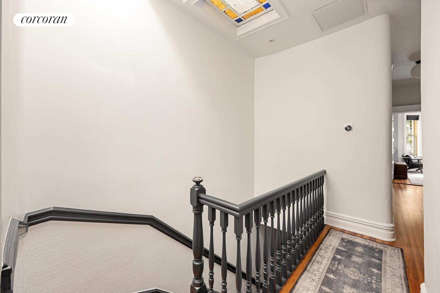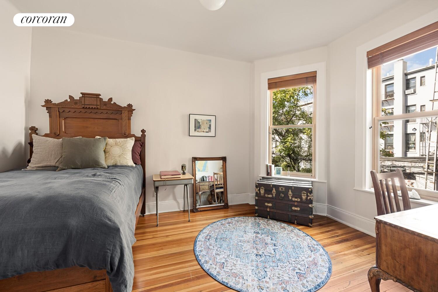 Head upstairs to an equally large floorplate with infinite possibilities. Currently configured as 4 bedrooms with an oversized laundry room that includes a new LG ThinkQ Washer and Dryer. Use as-is, or make some simple modifications and enjoy a large primary suite. The one renovated bathroom on this floor could easily be expanded into a second windowed bathroom by taking over the laundry room and utilizing the existing waste line already in place for the laundry. This is an easy alteration, and with an additional 1.5 baths in the house, can even be done while you live there. You will be impressed with the leafy-green views visible through every room on this floor. And let's not forget the coziness of well-preserved historic details, and guaranteed quiet for sleeping whether you are in the front, or the back of the house. This one-way street is a light-sleeper's dream!