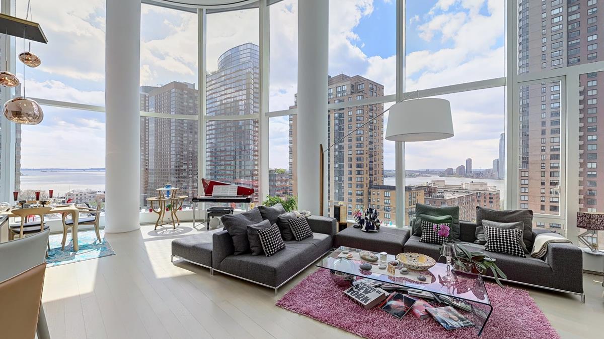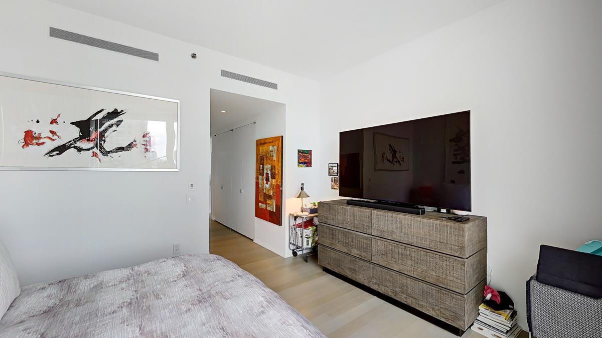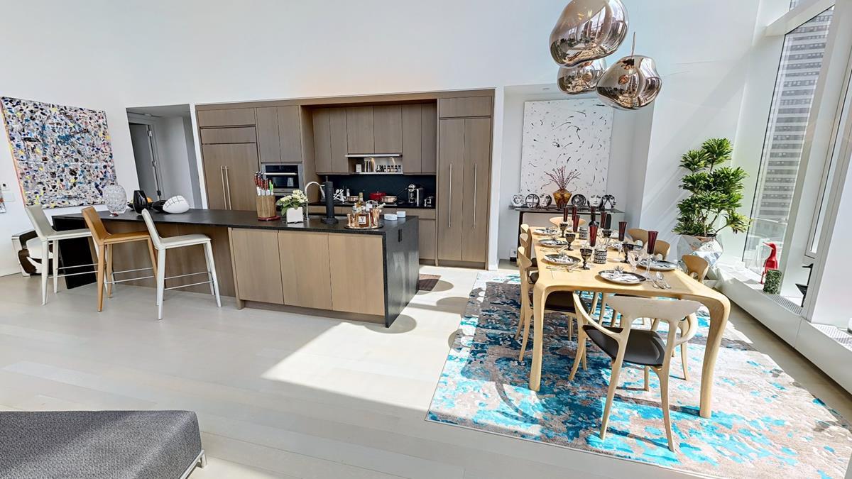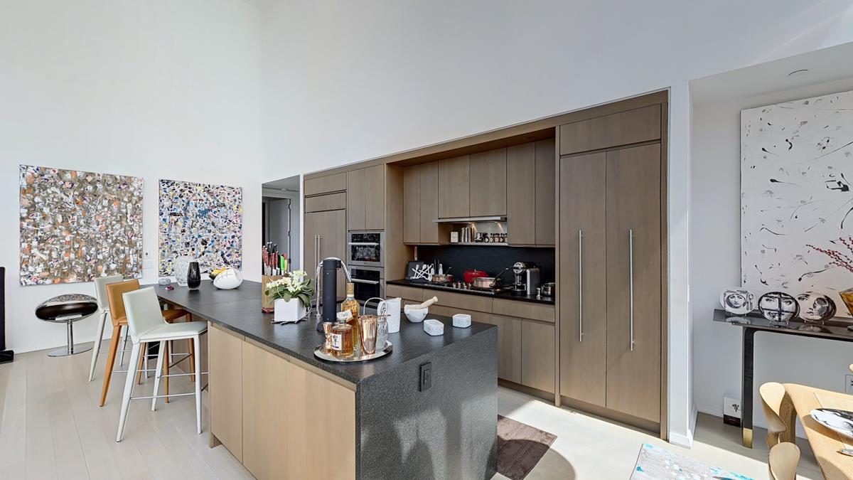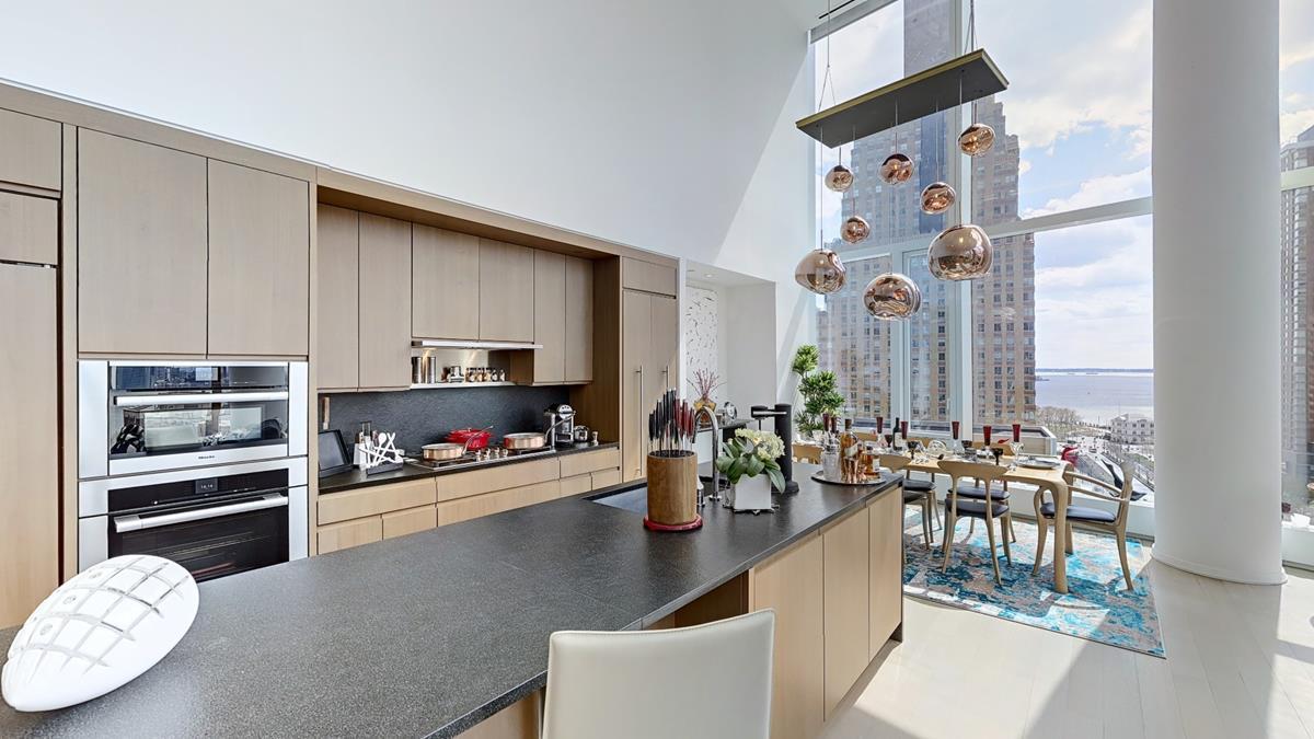 A gallery opens into a DAZZLING grand living room with 20FT ceiling and serene southern views of New York Harbor and Hudson Rover. This South-West 3 Bedroom 3.5 Bathroom has an open kitchen, a sprawling living room, and a powder room adjacent for guests. The expansive 2,302 square foot home features a granite waterfall island and an elegant Chef’s Kitchen with walnut cabinetry. Top of the line, integrated appliance from Miele and Subzero include a 5 burner gas cooktop, exterior vented exhaust hood, oven, speed oven, 42” side-by-side refrigerator/freezer, wine refrigerator, and dishwasher.