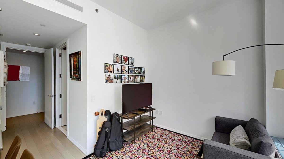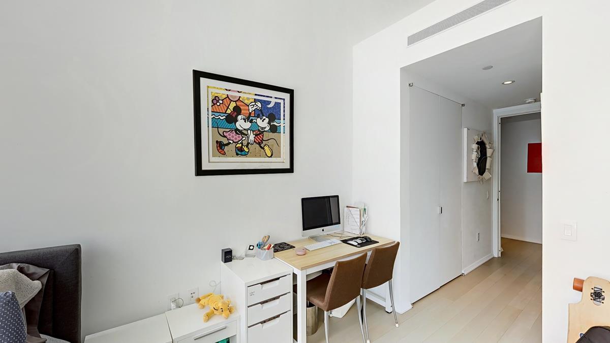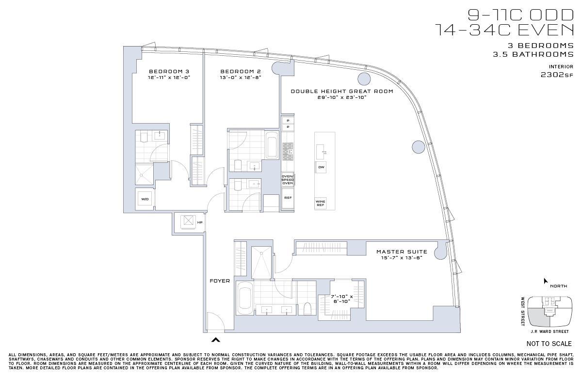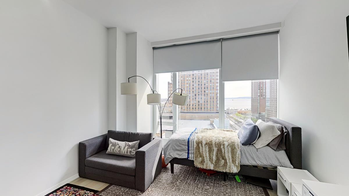 A gallery opens into a DAZZLING grand living room with 20FT ceiling and serene southern views of New York Harbor and Hudson Rover. This South-West 3 Bedroom 3.5 Bathroom has an open kitchen, a sprawling living room, and a powder room adjacent for guests. The expansive 2,302 square foot home features a granite waterfall island and an elegant Chef’s Kitchen with walnut cabinetry. Top of the line, integrated appliance from Miele and Subzero include a 5 burner gas cooktop, exterior vented exhaust hood, oven, speed oven, 42” side-by-side refrigerator/freezer, wine refrigerator, and dishwasher.