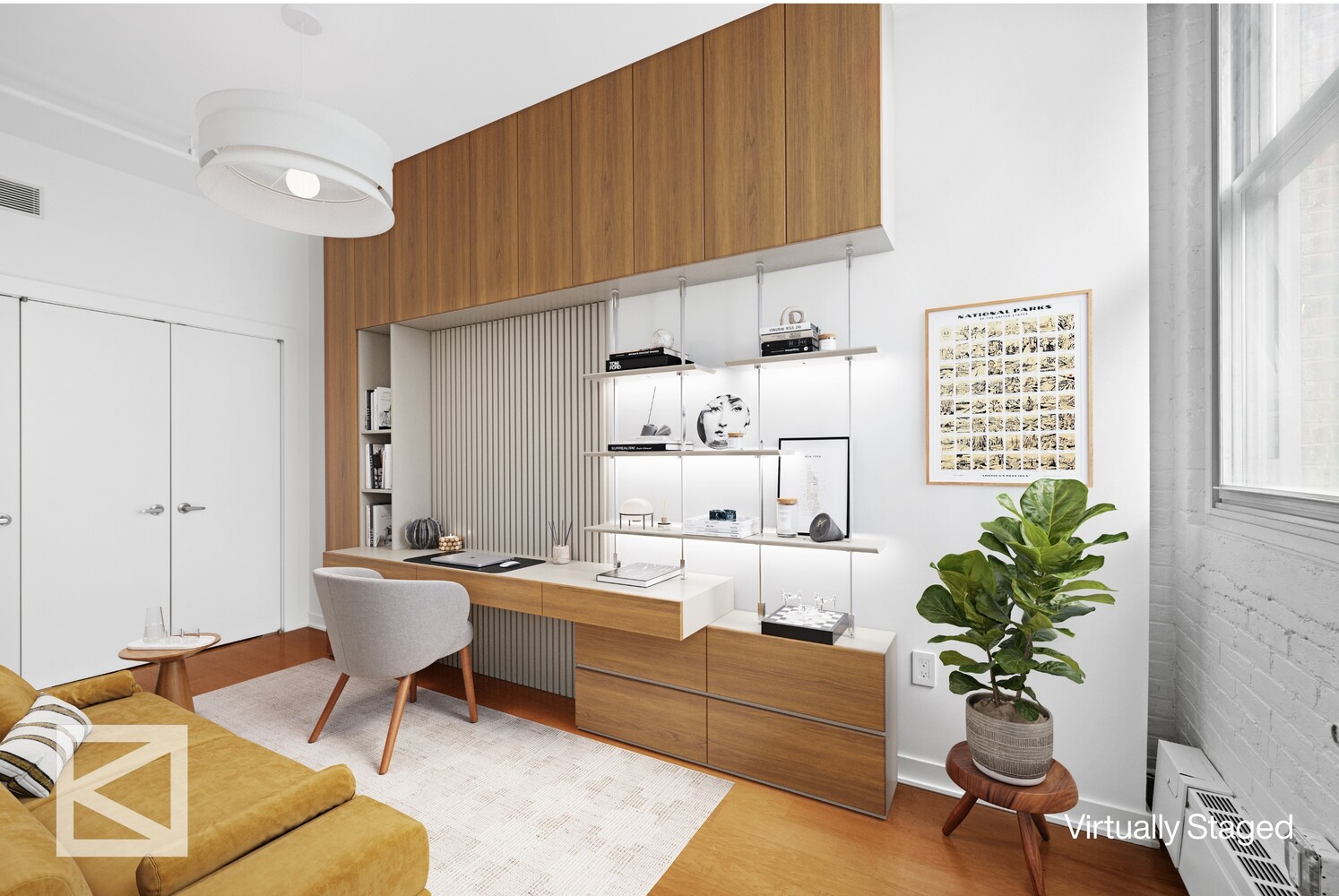 The loft seamlessly blends timeless charm with modern sophistication. The rich character of exposed wood beams and the warmth of exposed brick walls create an inviting atmosphere, enhanced by a real wood-burning fireplace and fantastic natural light that floods the entire space throughout the day. The highlight of this loft is a kitchen that provides brand-new Wolf appliances, a four-burner range complete with built-in external ventilation, and a phenomenal walk-in pantry coveted by the most serious cooks.