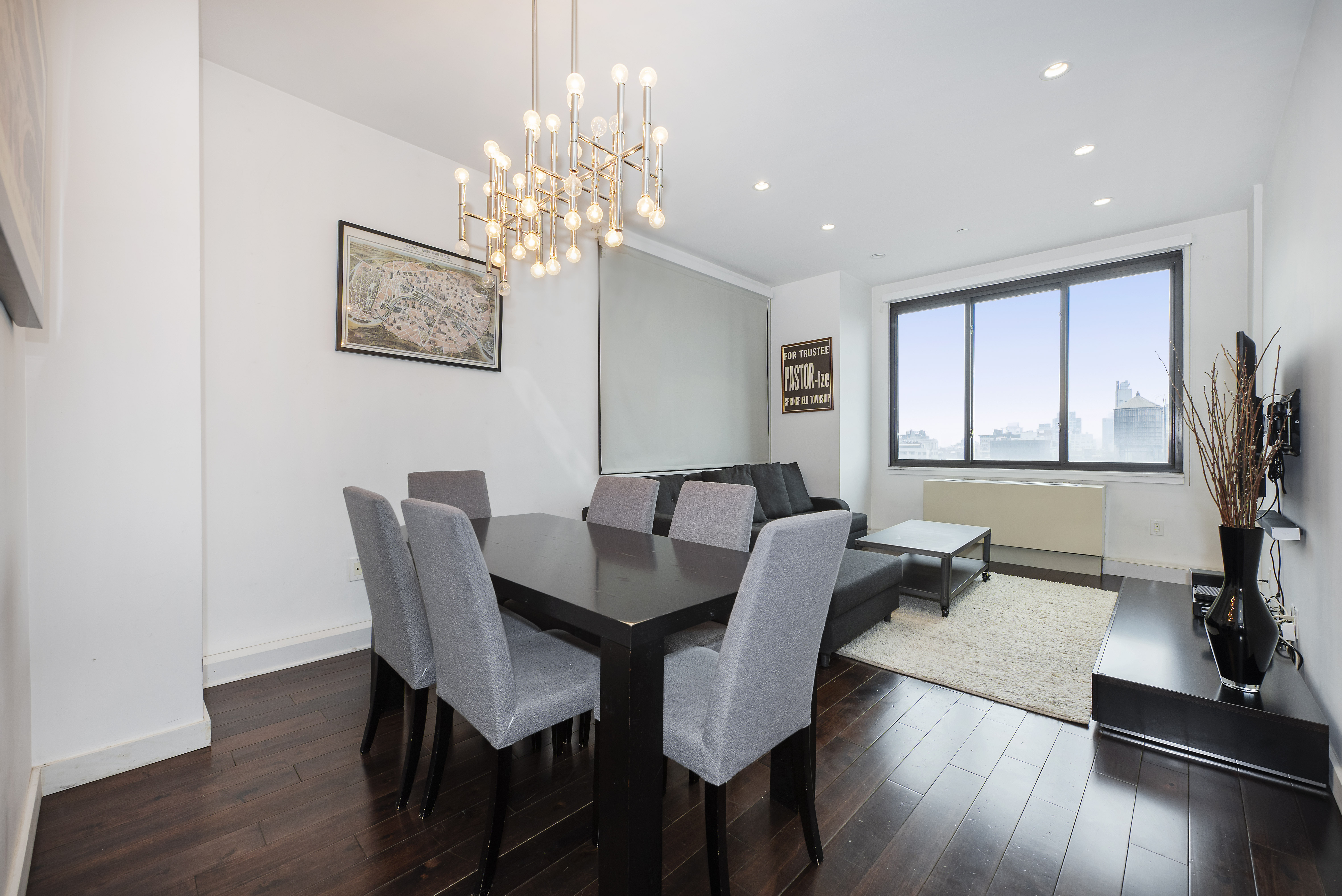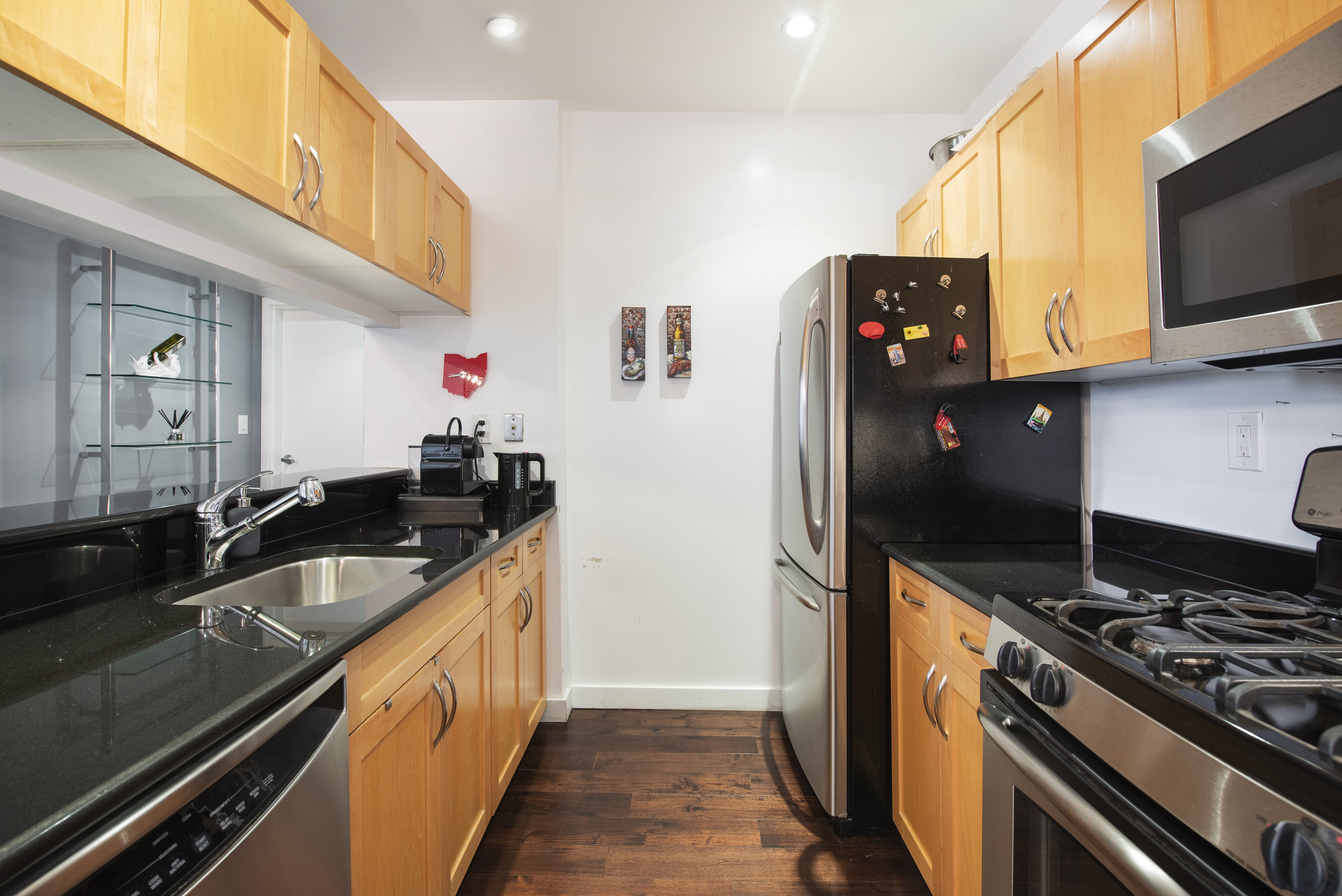 Designed with both elegance and functionality in mind, the residence features a thoughtful, spacious floor plan with rich hardwood flooring and soaring ceilings throughout. The chef’s kitchen is equipped with premium stainless steel appliances including a gas range, dishwasher, and mounted microwave. Marble bathrooms offer abundant storage and a refined aesthetic. Both bedrooms include generous closet space (not shown on the floor plan), and there is also a large walk-in closet located directly outside the bedrooms, providing exceptional storage options. A dedicated laundry and utility room with washer/dryer adds convenience rarely found in Manhattan living. Individually controlled PTAC heating and cooling units in every room ensure year-round comfort.