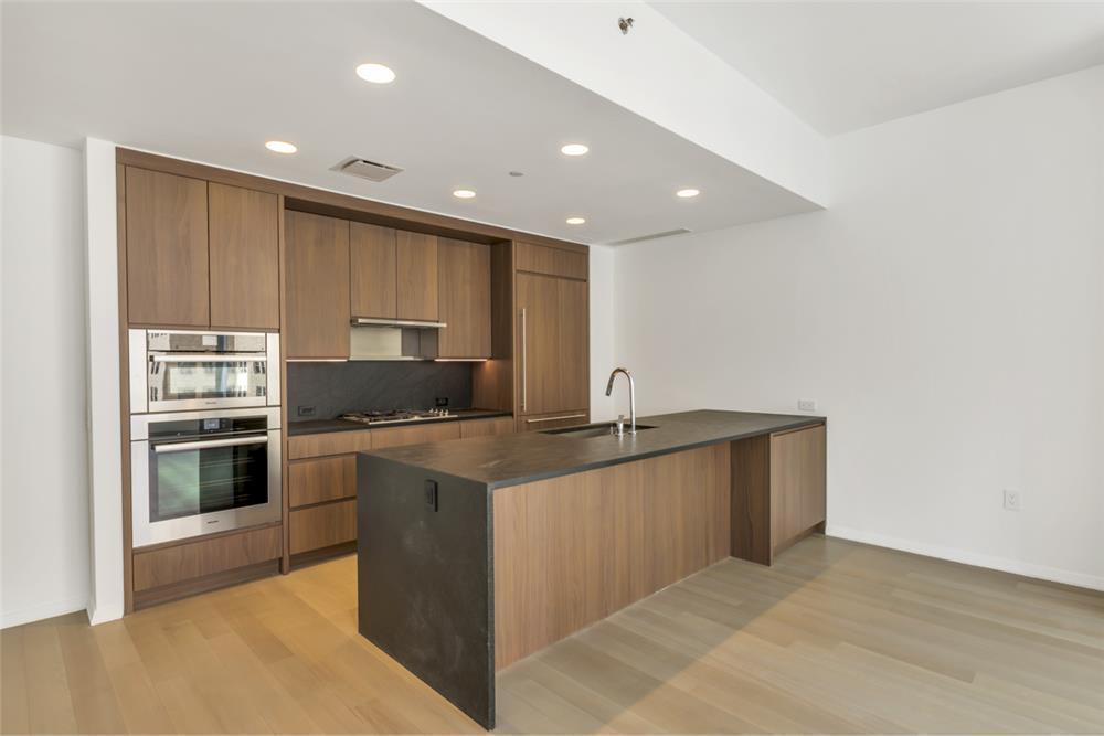 The chef’s kitchen is a showstopper, featuring custom-stained walnut cabinetry, granite countertops, and a waterfall island. Outfitted with top-tier Miele and Sub-Zero appliances—including dual wall-mounted convection ovens, a gas cooktop, refrigerator, freezer, wine fridge, dishwasher, and a range hood vented directly outside—this kitchen is both functional and refined.