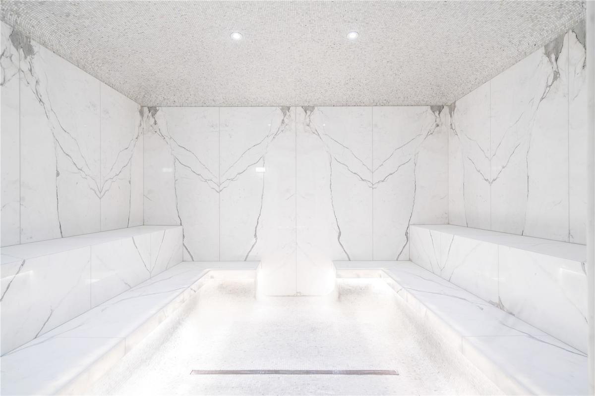 The primary suite includes a luxurious five-fixture en-suite bath, complete with a floating, backlit marble vanity, radiant heated floors, Hansgrohe polished chrome fixtures, a stall shower, deep soaking tub, and an electronic Toto toilet with built-in bidet. The secondary bath and powder room are equally elegant, with marble wet walls and floors, and custom vanities.
