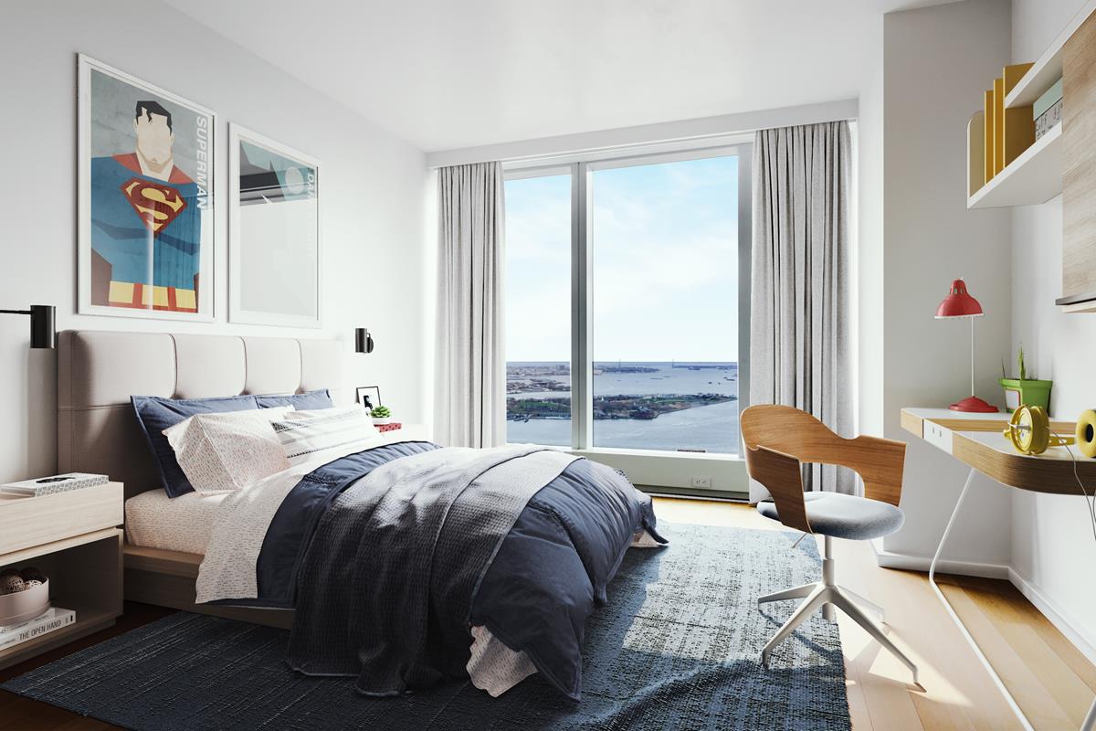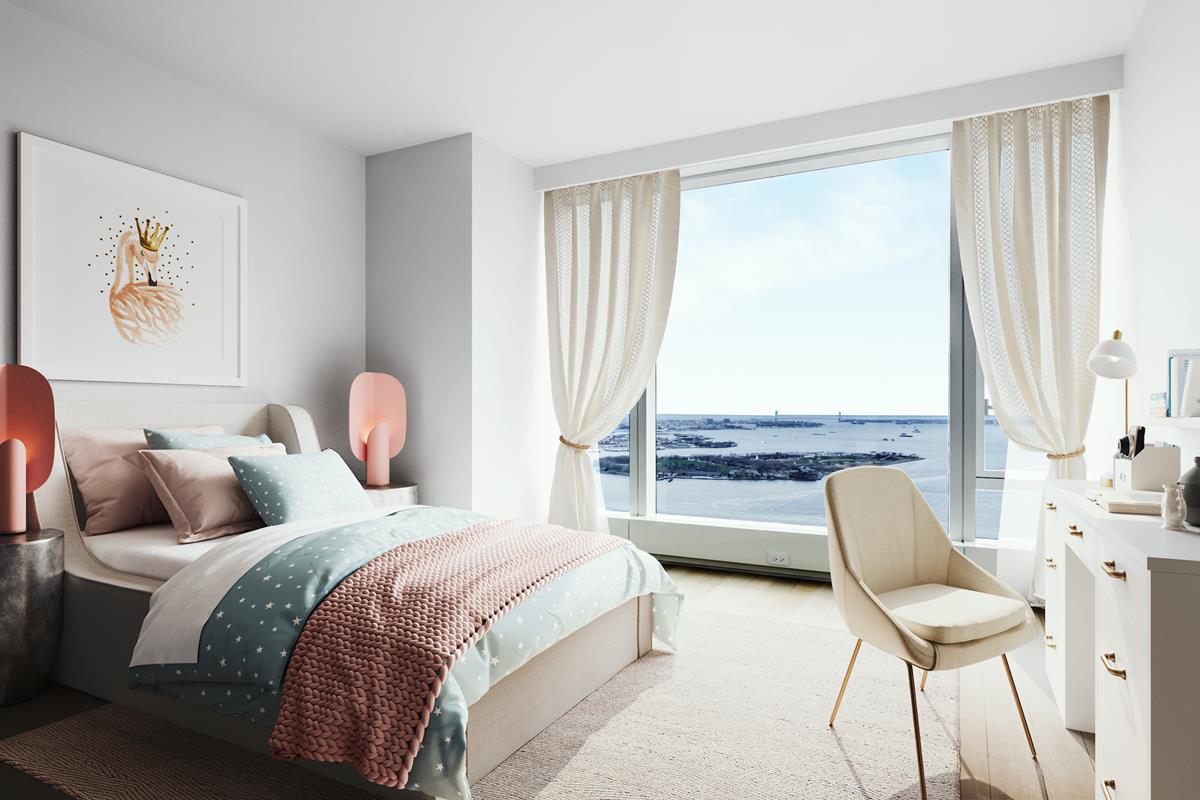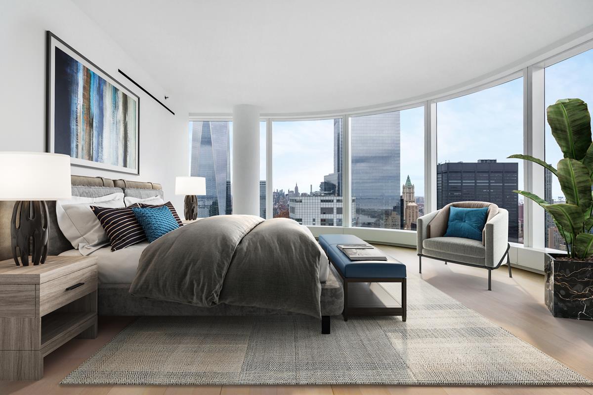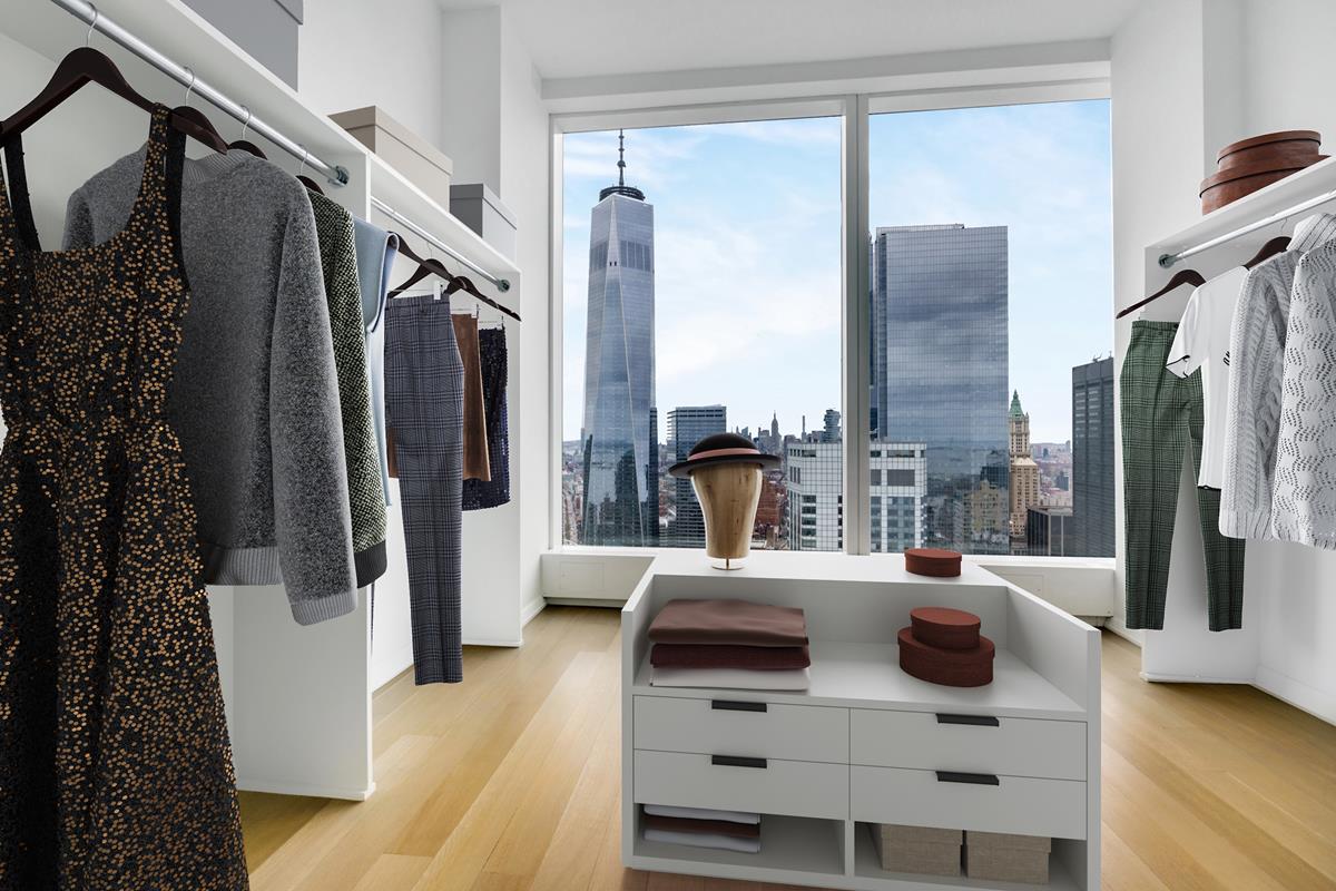 Secluded in the Northeast wing of the residence, the grand corner primary suite, offers stunning One World Trade Center Tower view and good-morning sunrise East-facing views. Primary suite offers two massive walk-in closets plus huge windowed dressing room. Windowed en-suite bath finished with custom slab marble feature walls, radiant heated floors, steam shower, sauna, Toto water closet, and double vanities. Two additional light-filled bedrooms feature an en suite bath and have an incredible water views. A full Fourth Bath, washer, vented dryer and oak hard-wood floor through complete this magnificent Penthouse residence.