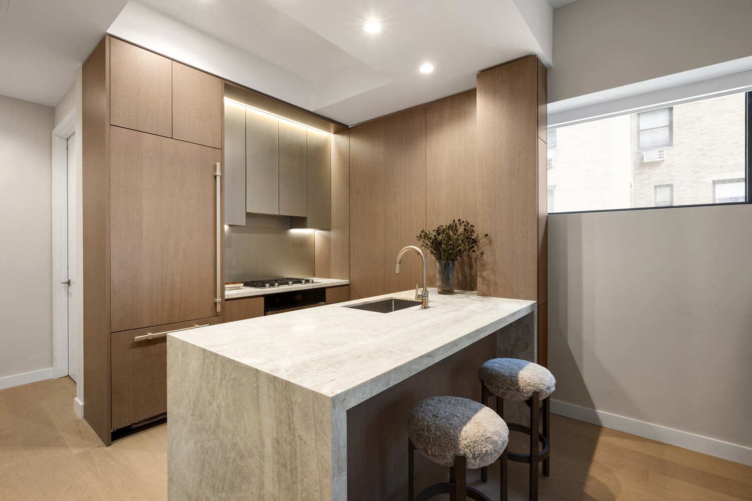 The open kitchen is a sculptural presence, with a palette of honed Taj Mahal quartzite countertop and rift-sawn White Oak and custom glass cabinetry offering both restraint and richness. A full suite of JennAir appliances, including oven, cooktop, microwave drawer and paneled refrigerator, are seamlessly integrated and complete with countertop seating and a custom glass backsplash. Interiors are finished with 4-hinge solid wood interior doors throughout. An in-residence Bosch washer and dryer complete the home's suite of refined amenities.