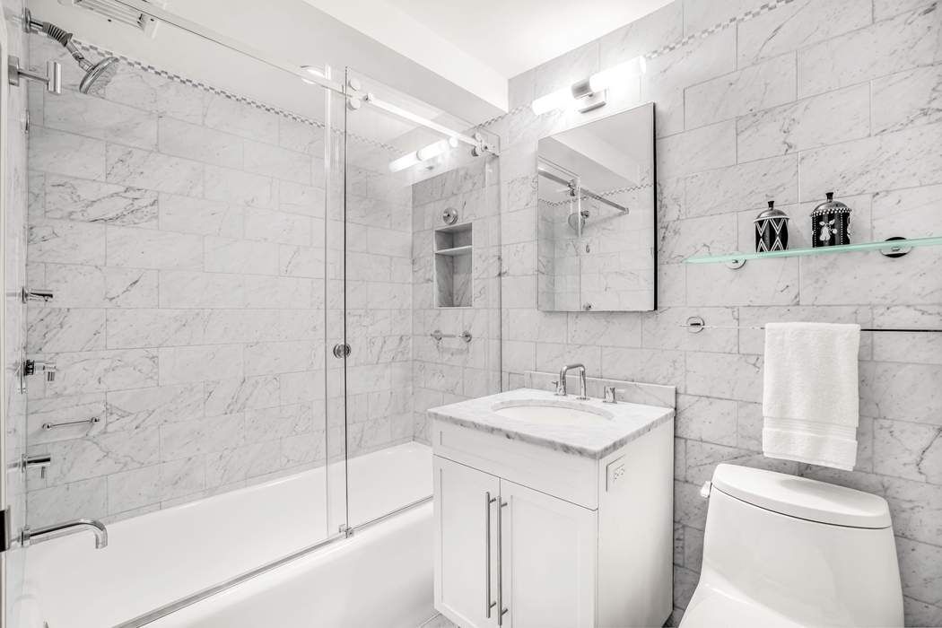 The coveted winged bedroom layout ensures privacy, with each bedroom separated by the main living space. Oversized closets provide remarkable storage. The renovated marble bath features glass enclosed shower, soaking tub and custom cabinetry. Throughout this home, hardwood floors, prewar details, custom display cabinetry, generous proportions, thru-the-wall air-conditioning units, corner primary suite, secondary bedroom with dressing room and welcoming foyer imbue 11L with a comfortable lifestyle.