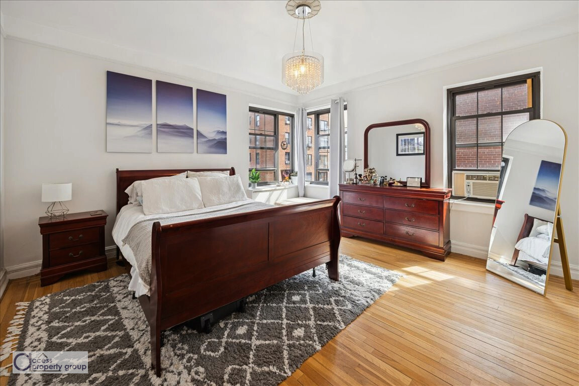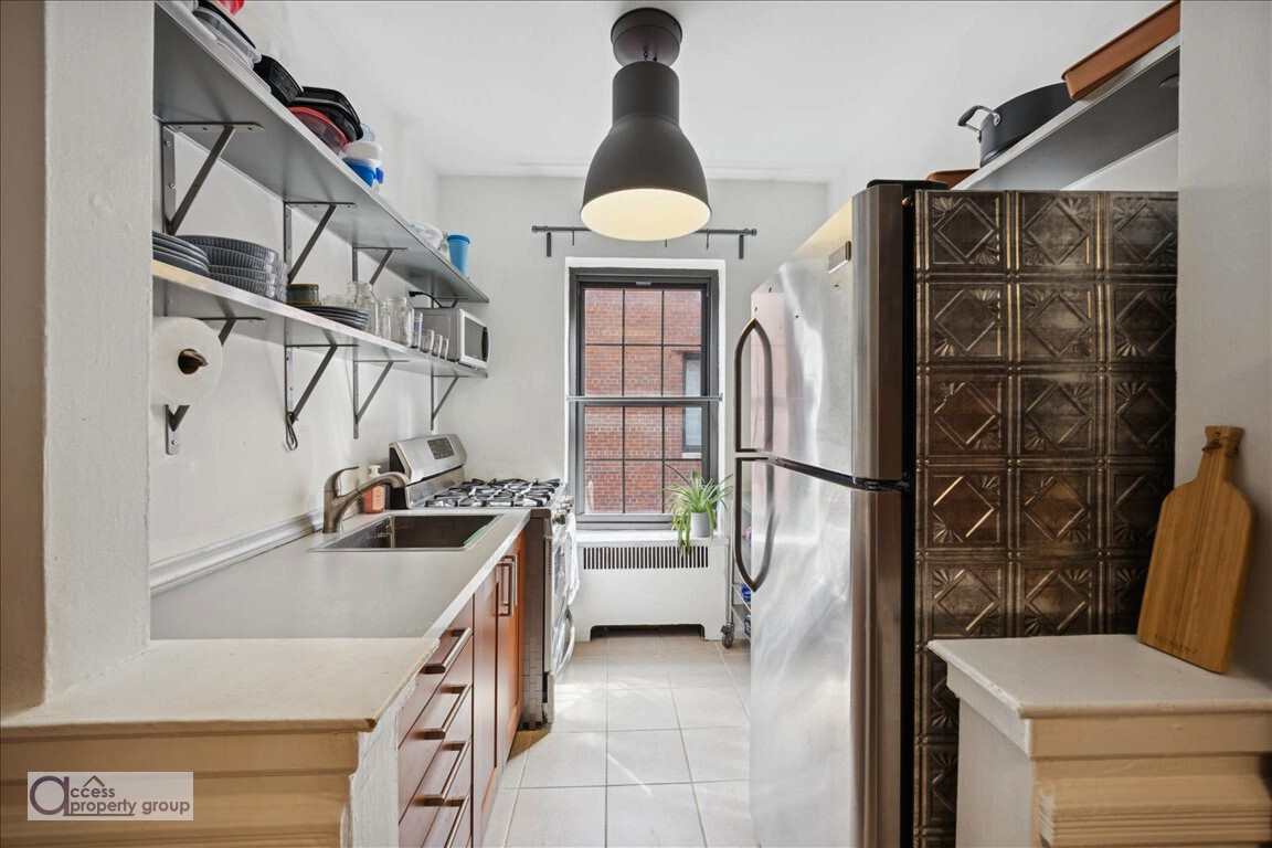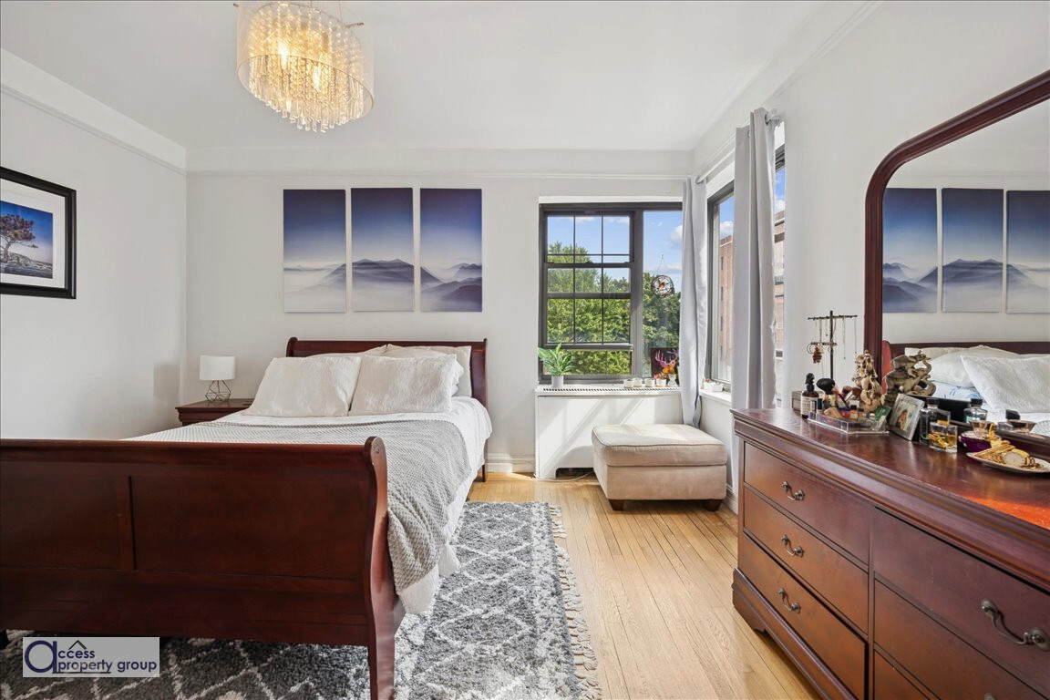 There's an immediate sense of space when you walk in with the foyer opening to an expansive sunken living room, complete with lovely wrought iron railings and intricate woodwork around the deco arch. The kitchen with a large eat-in area has been tastefully renovated with warm cherry wood cabinetry and open shelving, and features stainless appliances. The bathroom is a charming throwback where the beautifully maintained original features have been matched with period appropriate upgrades. The huge bedroom with enchanting morning light through a corner window has two exposures and two closets. Other deco details include stunning herringbone/hardwood floors with inlays, a unique full-size built-in bookshelf, and picture moldings throughout - folks, this is simply pure charm!