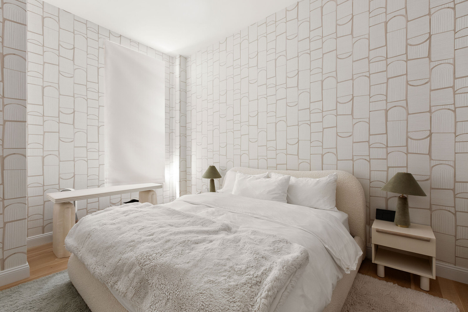 The primary suite is a private world of its own, offering dual ensuite bathrooms - one with a built-in sauna and soaking tub, the other clad in Valentina-honed marble - and a massive walk-in dressing room with herringbone floors off the primary, includes Holly Hunt Converge wallpaper, and a custom Opera d'Arte marble vanity, built out with all custom woodwork, creating a true dressing-room experience.