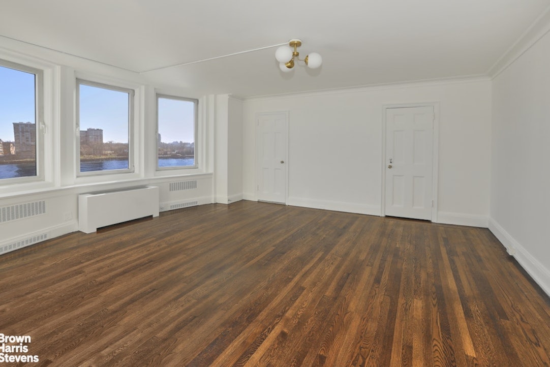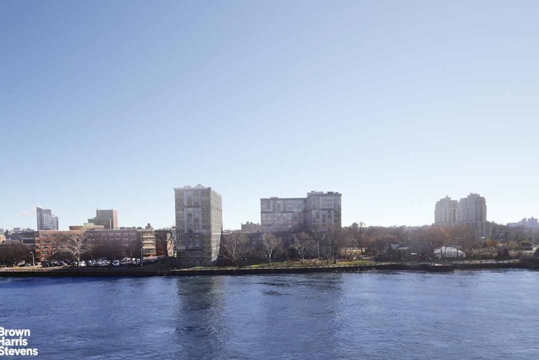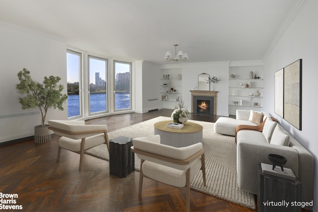 The spacious 28-foot living room is truly impressive with high ceilings, a working wood-burning fireplace, and a beautiful bay window that affords sweeping views of the East River. Adjacent to the living room, the private library provides a versatile retreat. With an ensuite bath and additional wet bar, the library is perfectly suited as an inviting extension of the home's entertainment areas, or as an extra bedroom, if desired.