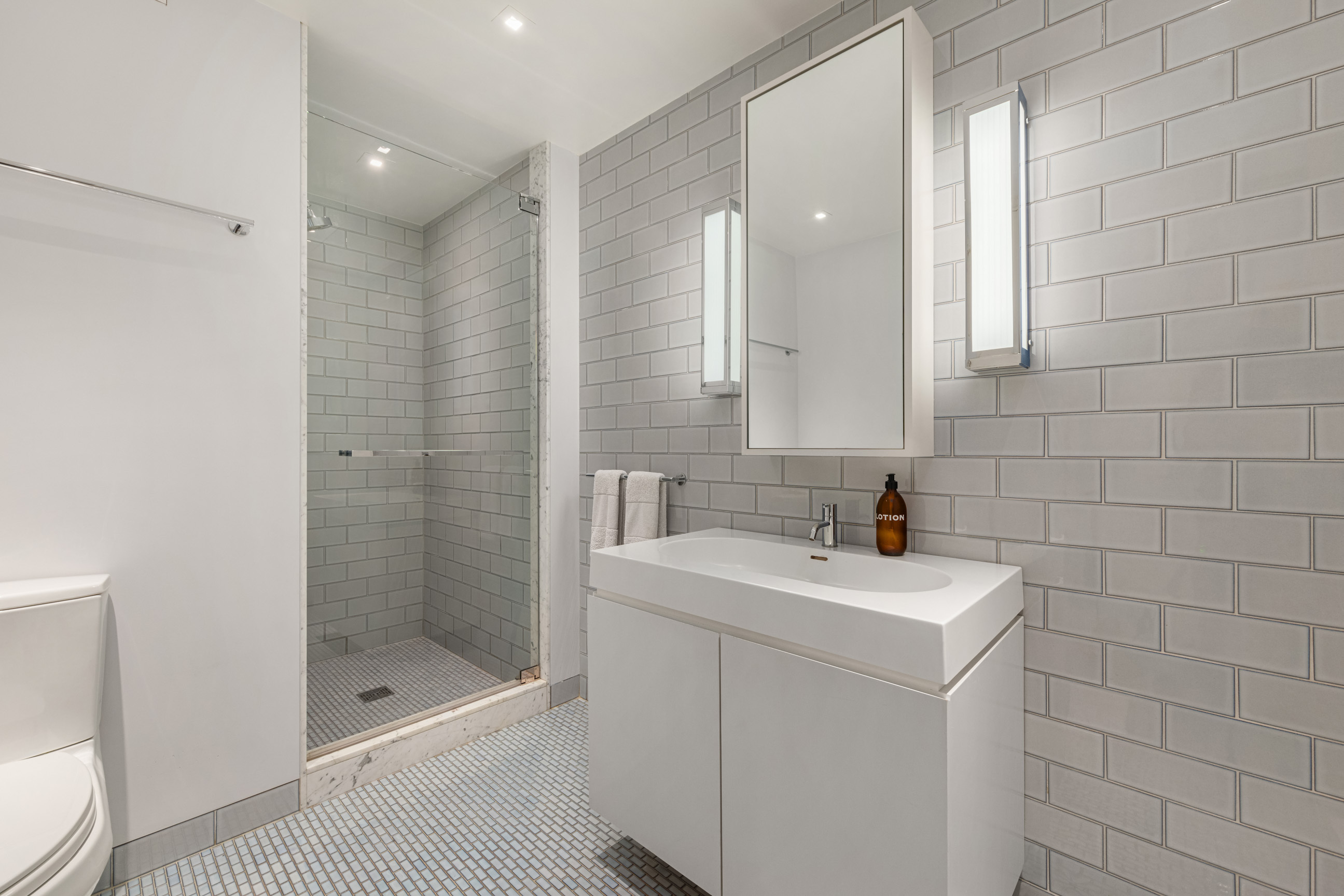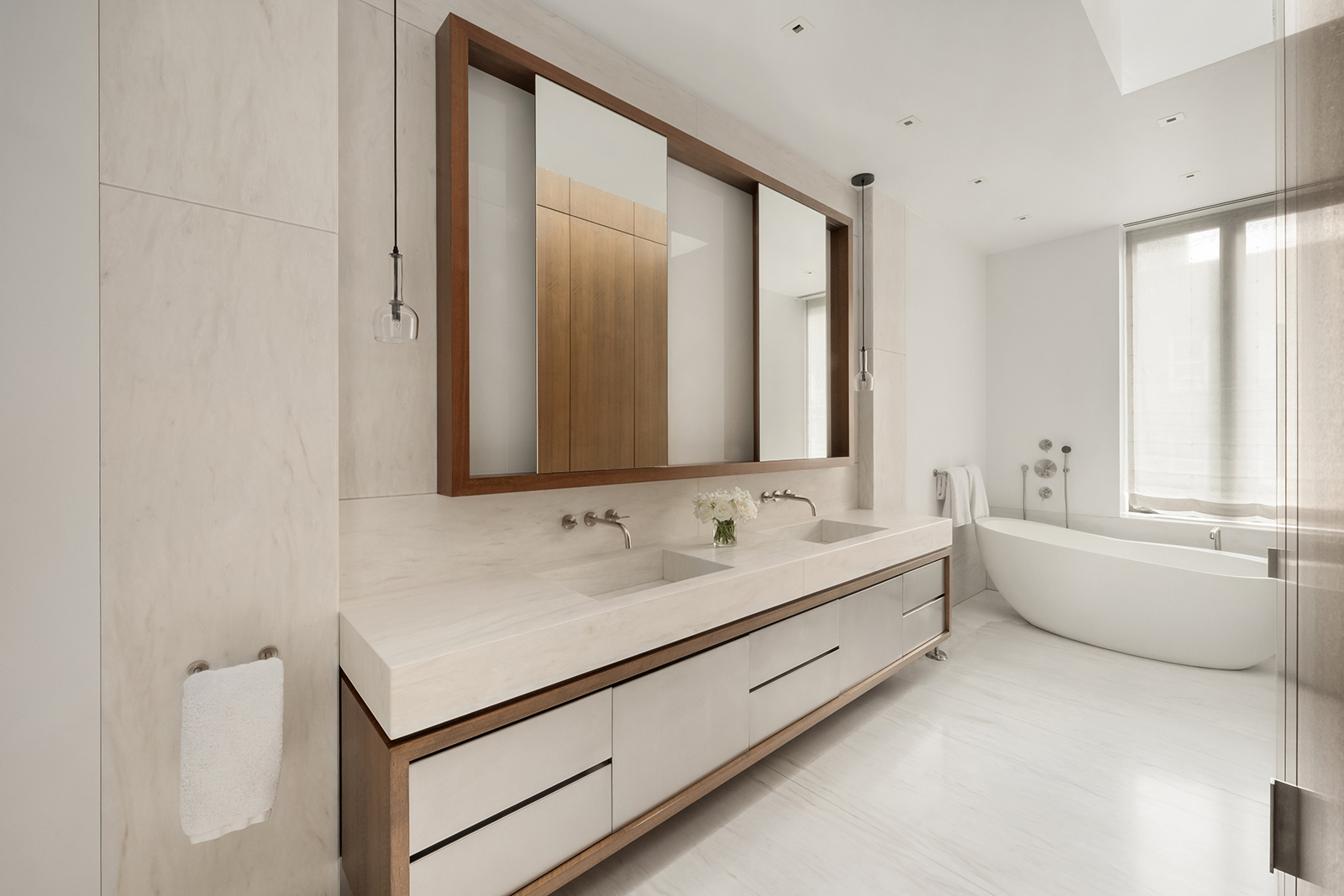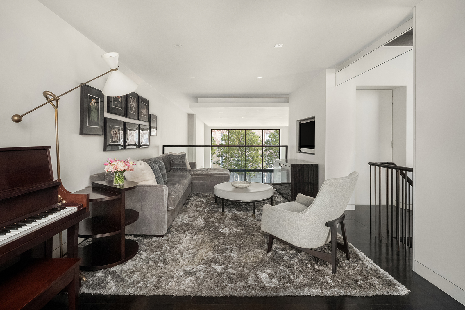Ascending to the second floor via the architectural steel staircase, you are greeted by the media room, overlooking the double height great room and garden below. This level also features a grand living room with dramatic 18’6” ceiling heights, floor-to-ceiling windows and a marble fireplace, beautifully framed by wood paneling. On the third floor, an oversized bedroom suite opens onto a large, south-facing terrace. The ensuite bathroom is accessed through a dressing room, and features custom herringbone and subway tiling. A wall of custom closets and a separate walk-in closet complete this third floor suite.