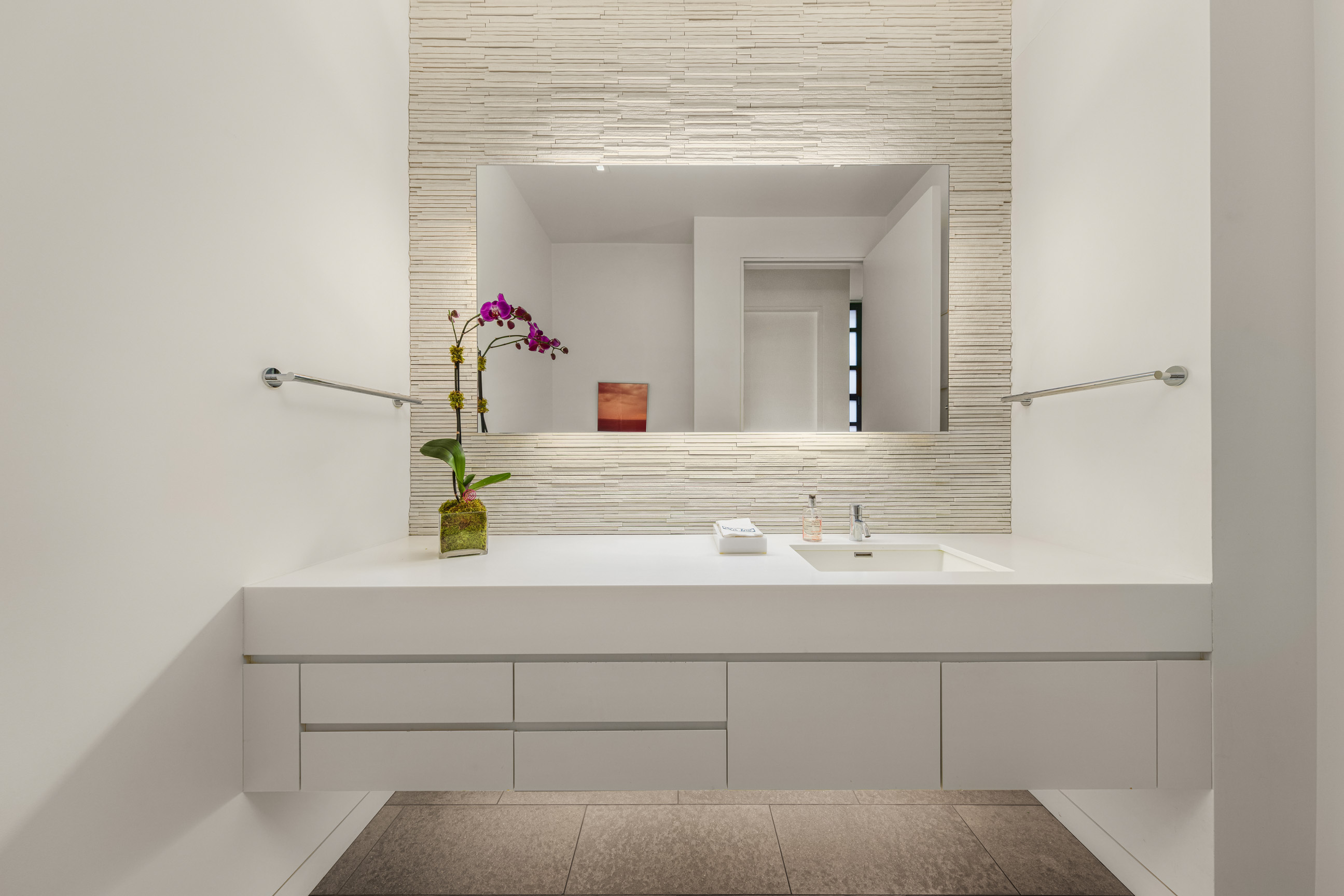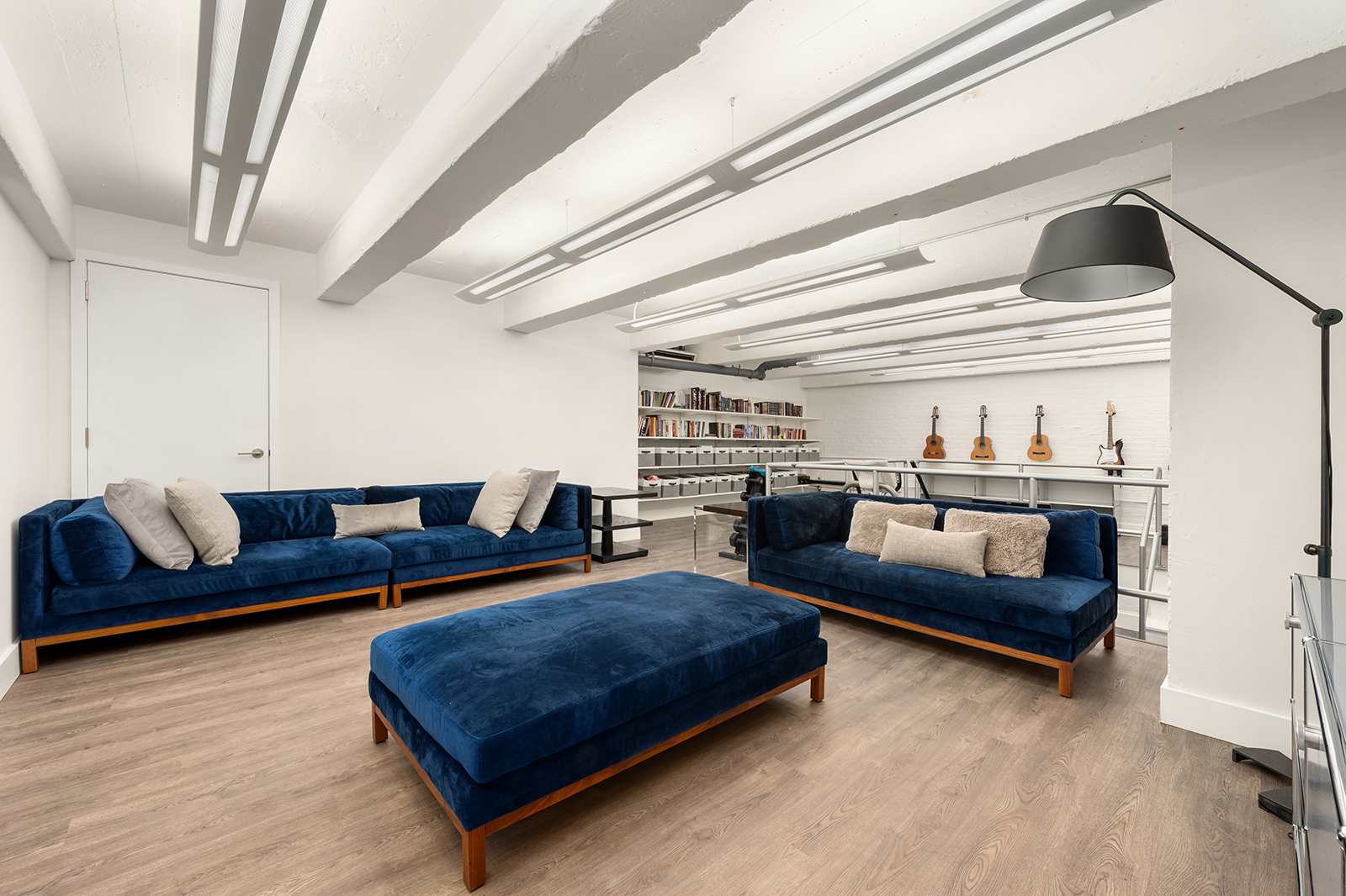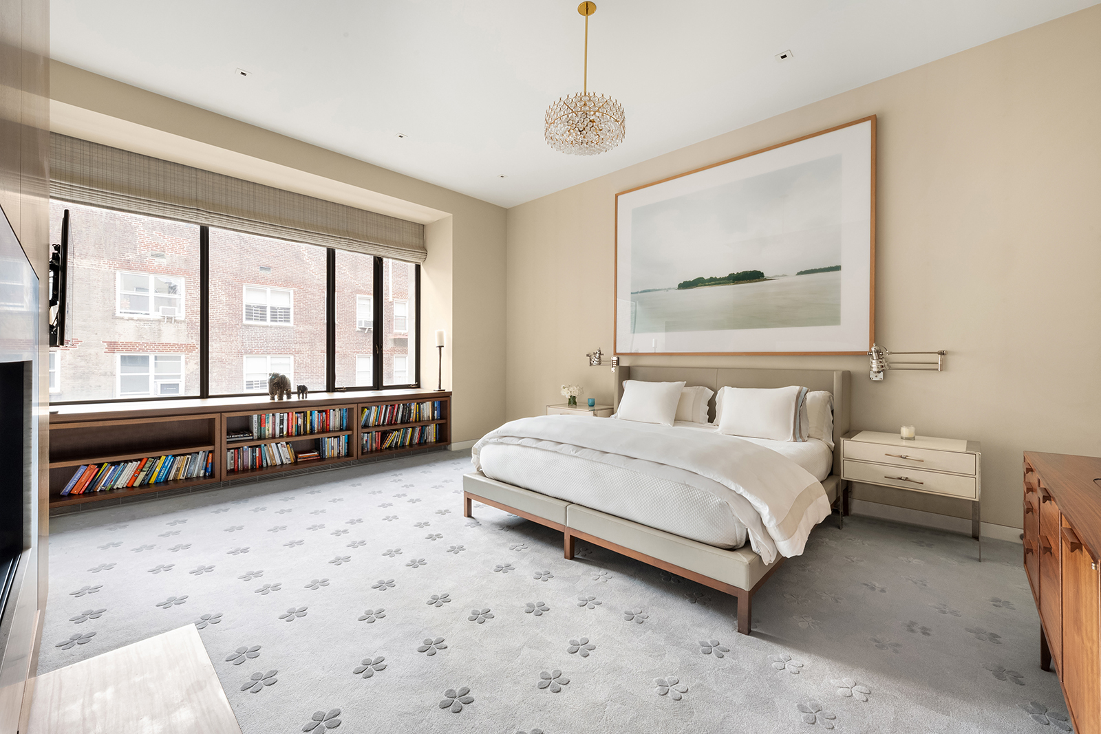 Ascending to the second floor via the architectural steel staircase, you are greeted by the media room, overlooking the double height great room and garden below. This level also features a grand living room with dramatic 18’6” ceiling heights, floor-to-ceiling windows and a marble fireplace, beautifully framed by wood paneling. On the third floor, an oversized bedroom suite opens onto a large, south-facing terrace. The ensuite bathroom is accessed through a dressing room, and features custom herringbone and subway tiling. A wall of custom closets and a separate walk-in closet complete this third floor suite.