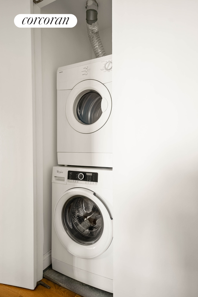 The king-sized primary suite enjoys abundant light from northern and eastern exposures and features a spa-inspired en-suite bathroom with heated floors, a glass-enclosed shower, and a deep soaking tub. The second bedroom is equally bright and spacious, with its own en-suite bathroom, making it ideal for guests or family. A stylish powder room off the entry foyer provides additional convenience, while polished chrome finishes and gleaming tiles elevate the overall bathroom design. With the advantage of an in-unit washer and dryer and only one other residence on the floor, this apartment is a true Upper East Side rarity.