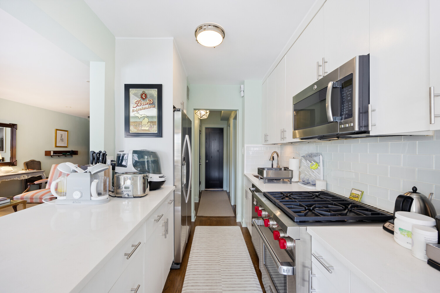 - Spacious 2BR/2Bth (convertible 3 BR) located in The Lafayette, a full service building located on Greenwich Village's coveted Gold Coast. This bright corner apartment features open southern and eastern exposures with quintessential Village views looking South down Greene Street. Entryway, which includes a huge walk-in closet, opens to generously proportioned living area with southern views. Kitchen is well equipped with Wolf range, Samsung refrigerator/freezer, and new Bosch dishwasher. Kitchen opens to the both living room and windowed dining area. Primary king sized bedroom hosts double exposures, large closets and windowed en-suite. Second bedroom is spacious with eastern exposure. Hallway outside guest bath includes another walk in closet for storage and linens and guest bath is complete with a shower/tub combination. Additional features include. hardwood floors, recessed lighting and the flexibility to convert the windowed dining area into a third bedroom.