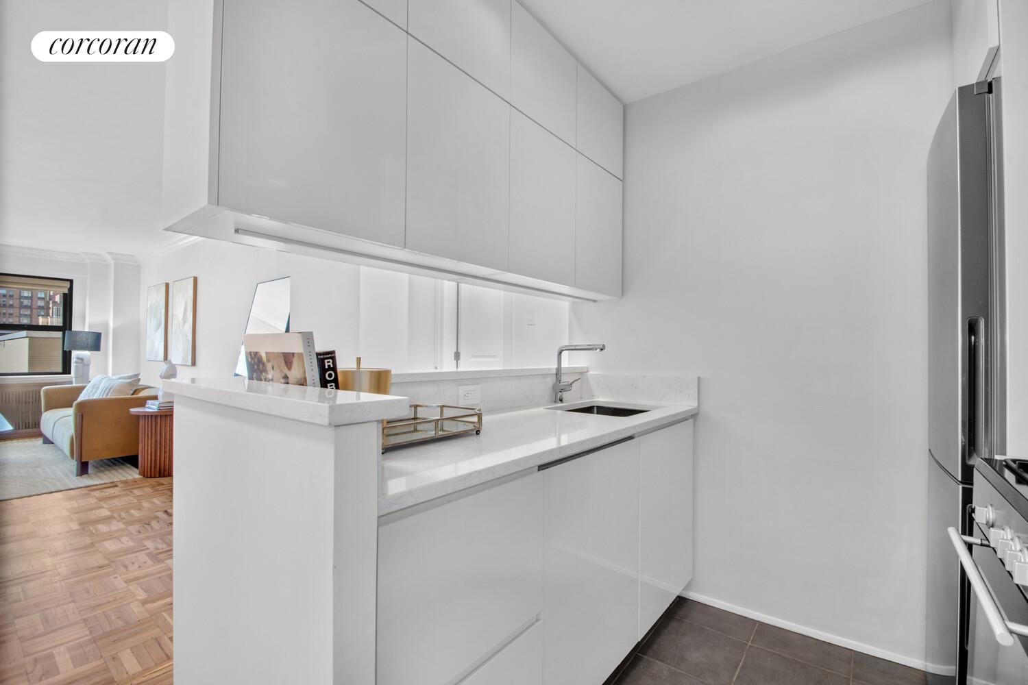 This beautifully renovated oversized one-bedroom apartment offers an impressive layout with a massive living room that comfortably allows for a dining area as well as dedicated office or work-from-home spaces. The open-concept kitchen is outfitted with sleek modern appliances, pristine white cabinetry, and quartz countertops-perfectly blending functionality with contemporary style.