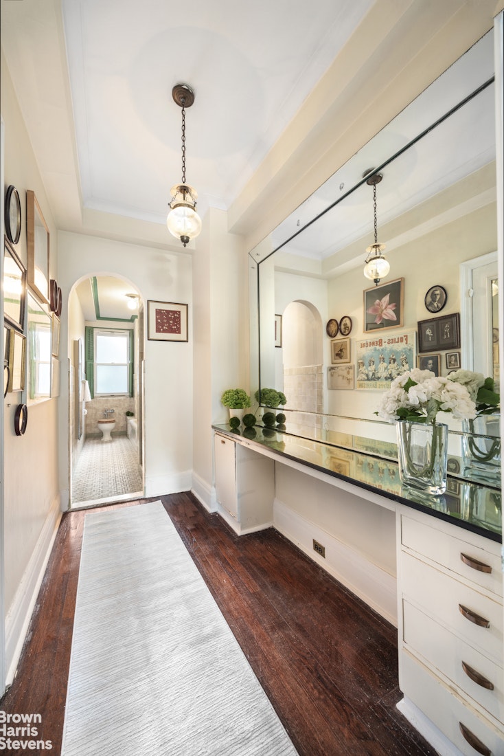The formal dining room, originally 21' x 13', has been thoughtfully reimagined to include a separate, windowed office/bedroom while still maintaining a distinct dining area - a flexible layout that suits modern living.