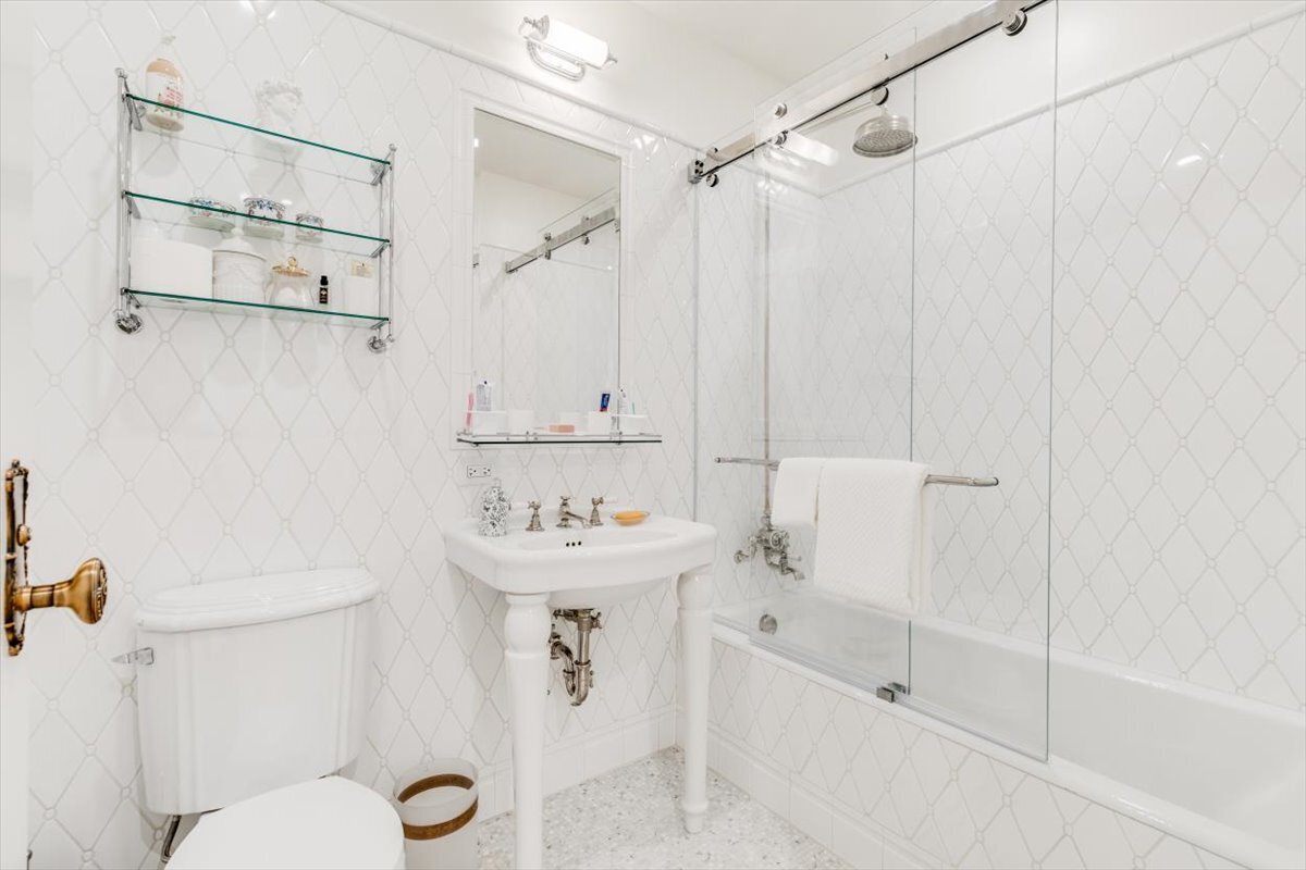 Enter through the building’s private, resident-only entrance and grand attended lobby. A gracious foyer and classic herringbone floors set the tone, leading to a spacious living area and a beautifully appointed, windowed chef’s kitchen. Outfitted with top-of-the-line Viking and Miele appliances, Nero Marquina stone countertops, and Calacatta marble mosaic backsplash, the kitchen is designed to impress.